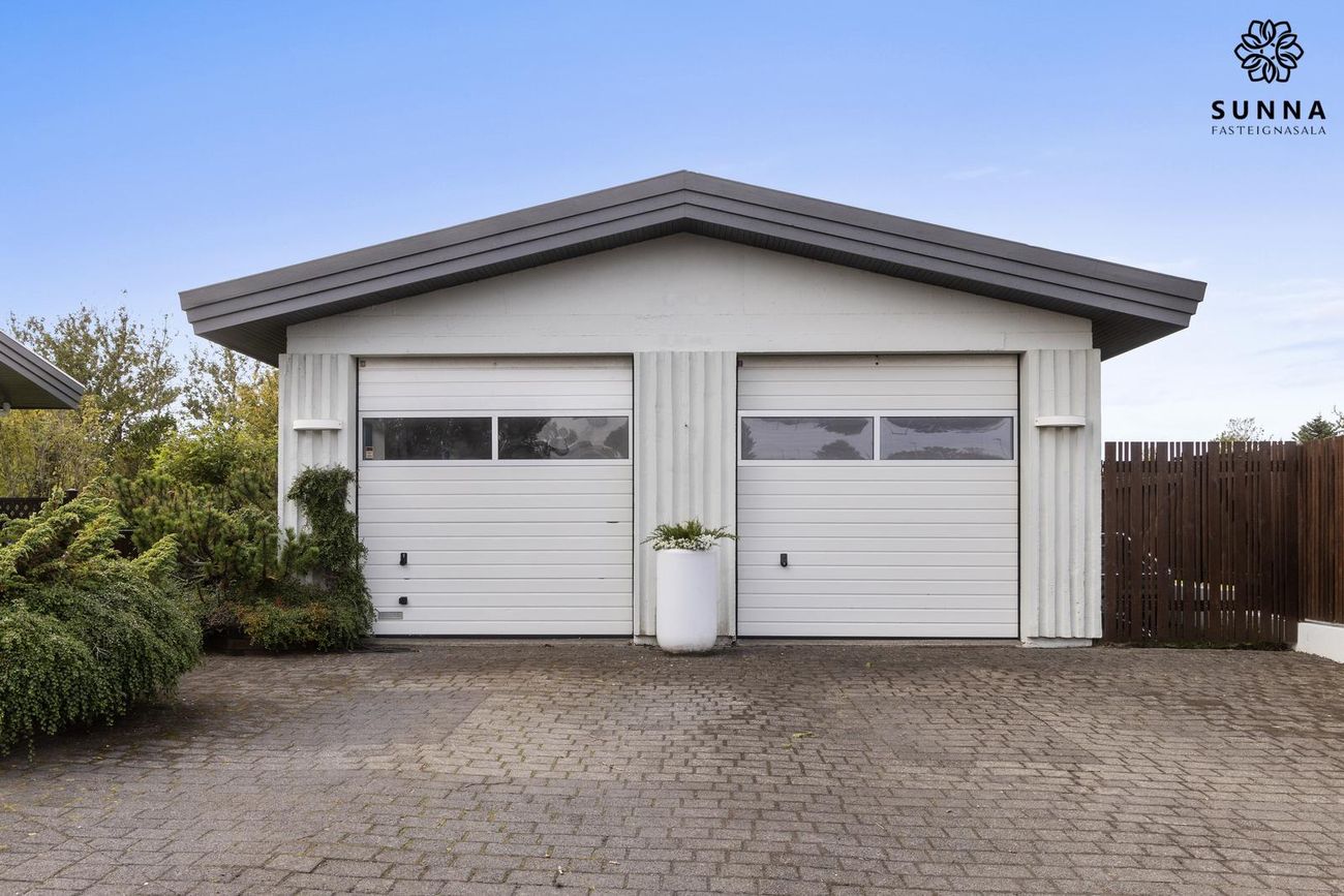 Tvöfaldur sérstæður bílskúr (56 fm) byggður 1993. Notaður sem vinnustofa/svissvæði með ~8 fm herbergi. Sambyggður bílskúr (53,5 fm) með innangöng frá forstofu.