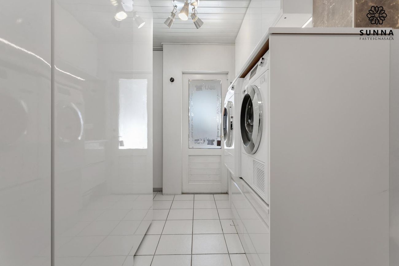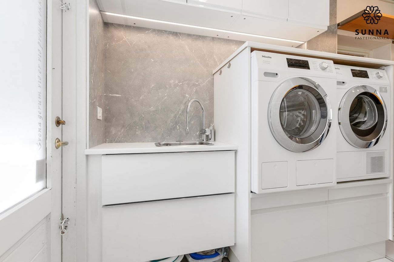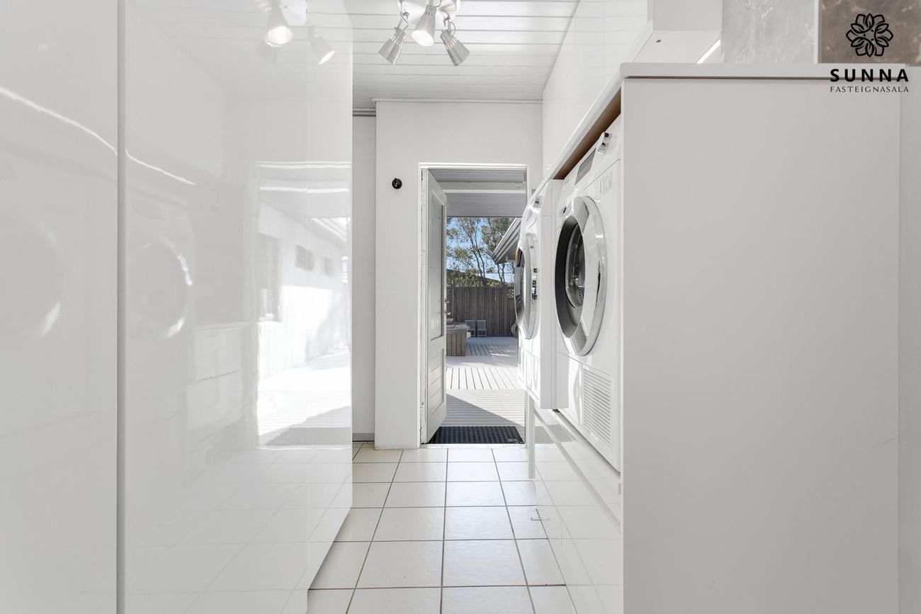 Þvottahús með mjög góðri innréttingu og miklu skápaplássi. Útgöngur á lokaðan pall.