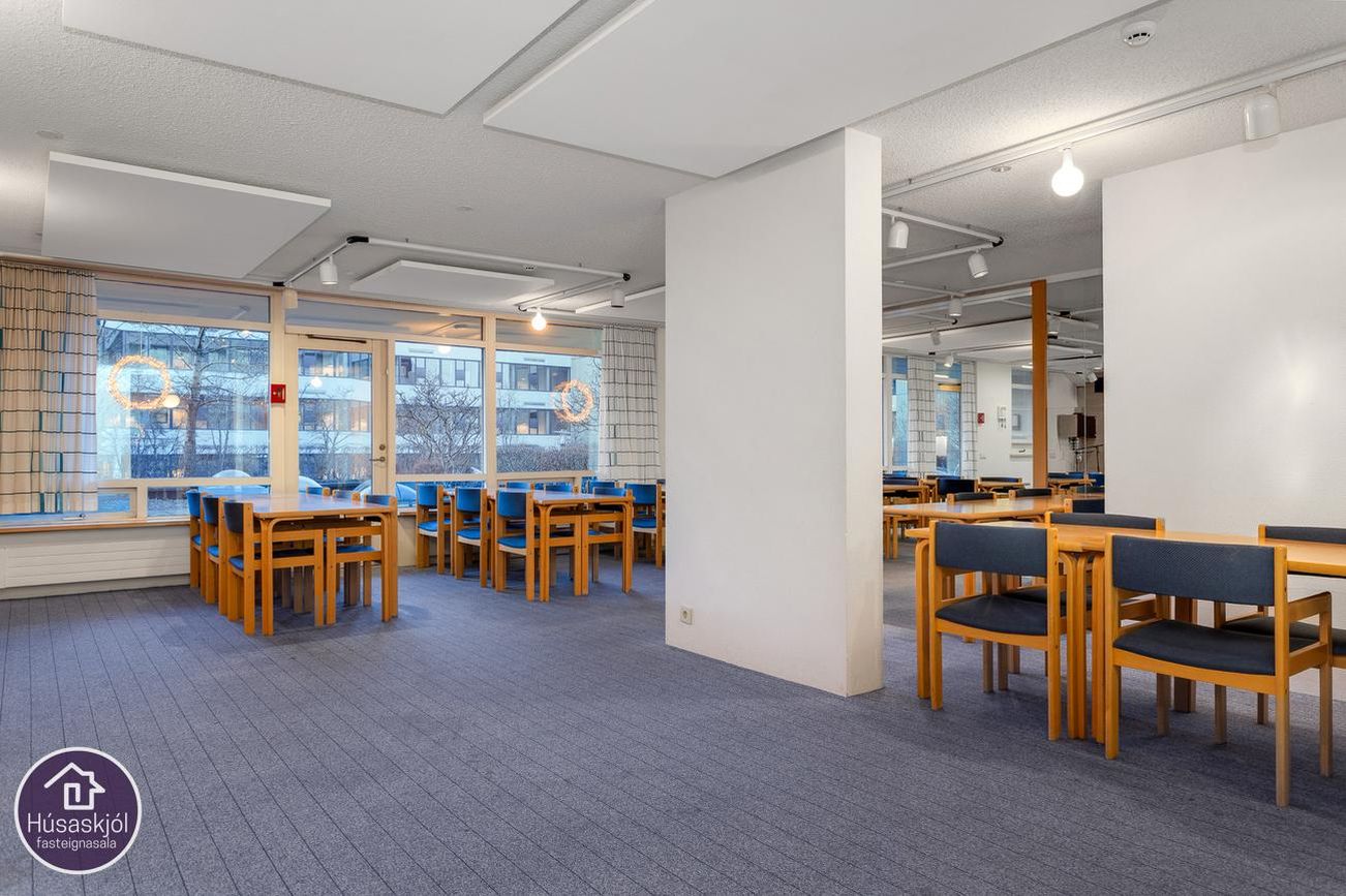 Sameiginlegur veislusalur með eldhúsi og útgengi á lóð til suðurs, flísalögð salerni. Skrifstofur og fundarherbergi á 1. hæð tilheyra sameign.