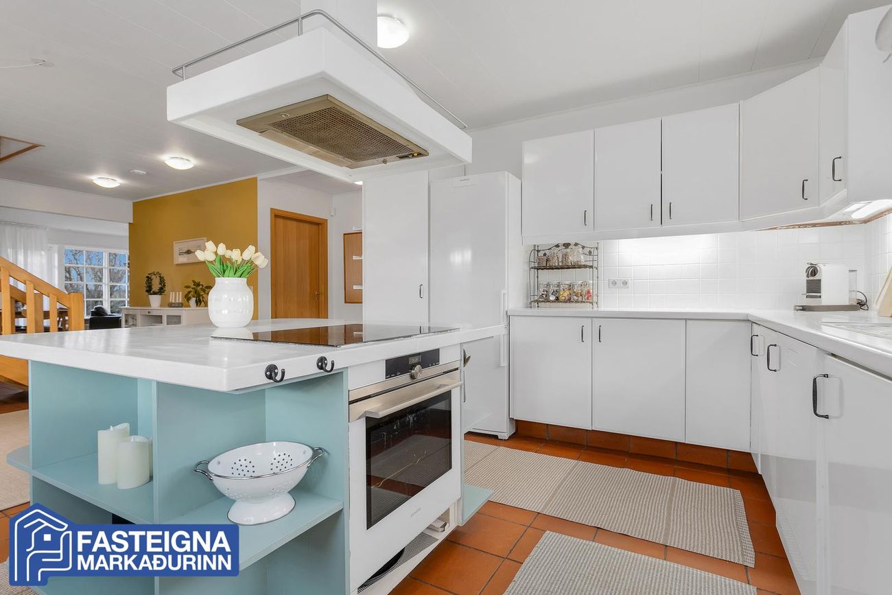 Eldhús, flísalagt gólf, hvít filmuð innrétting með viðarborðplötu, tengi fyrir uppþvottavél, eyja með nýju spanhelluborði og ofni, borðaðstaða er við glugga með fallegu útsýni.