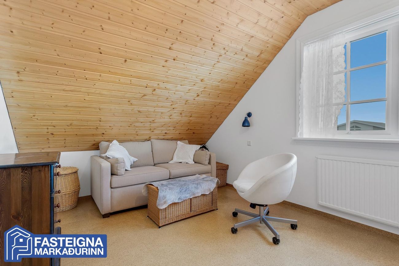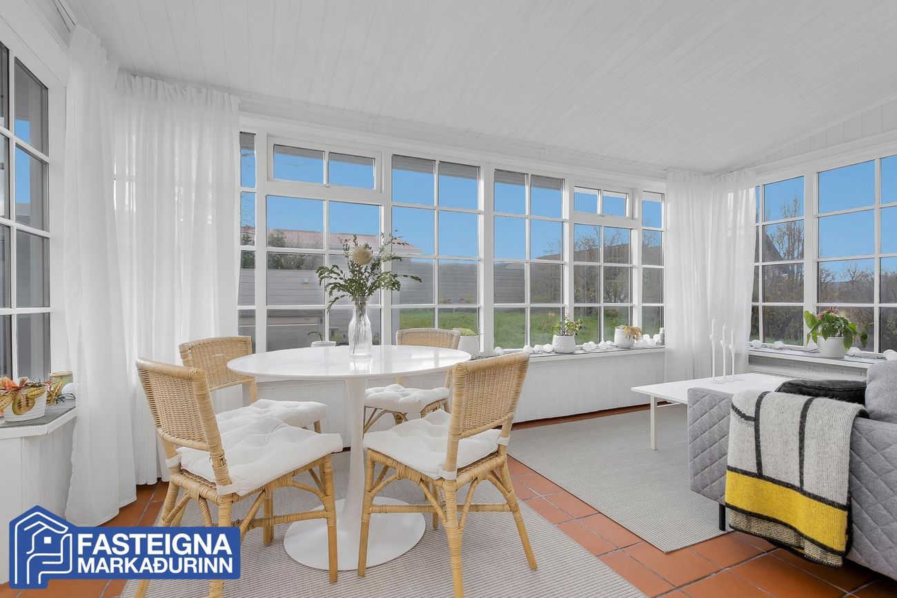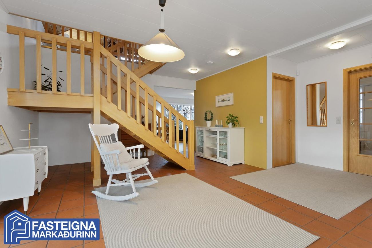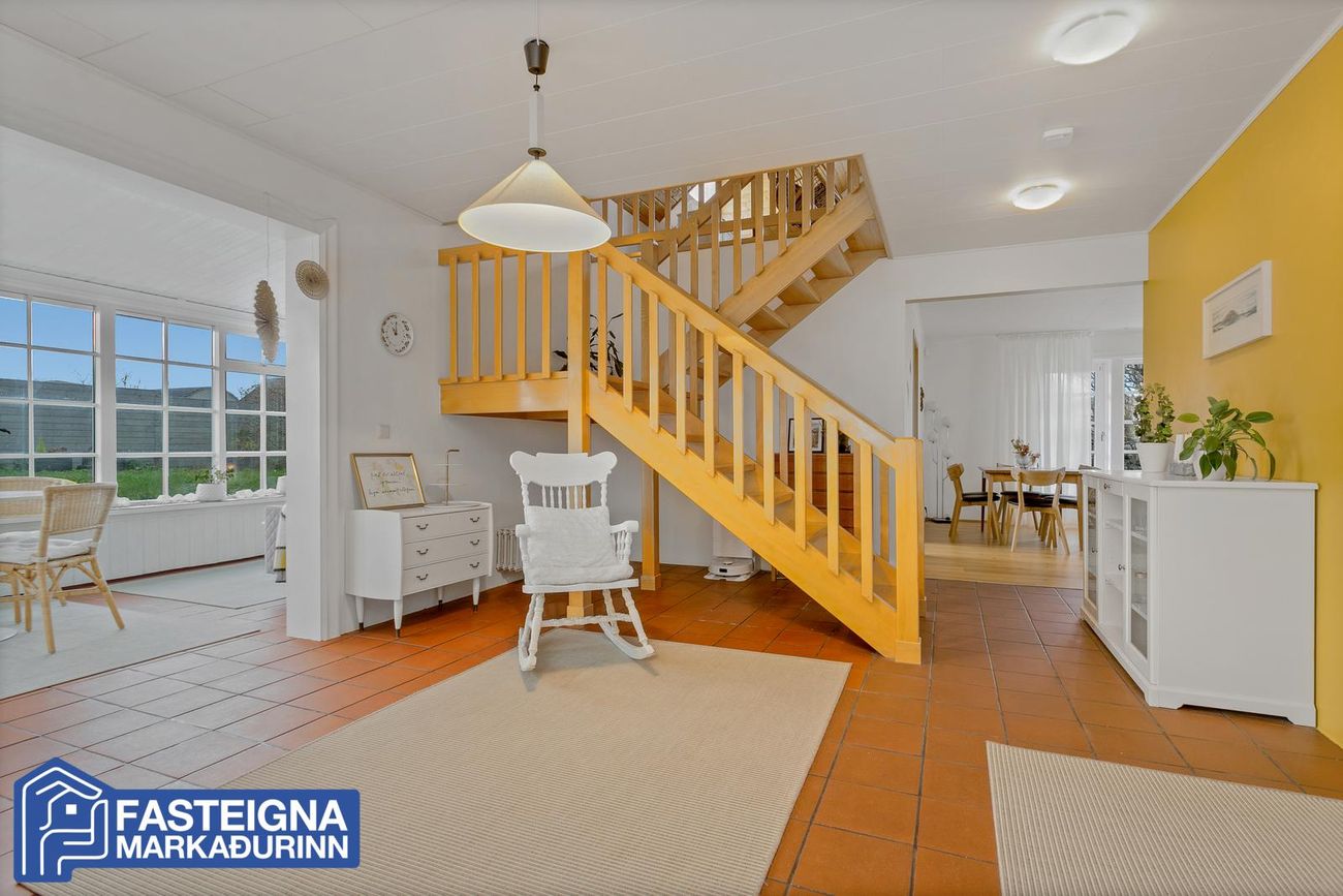 Að innan er húsið virkilega vel skipulagt og mikil lofthæð er á efri hæð þess þar sem eru þrjú svefnherbergi, sjónvarpsstofa og baðherbergi. Á neðri hæð eru m.a. 2 svefnherbergi, eldhús, stofa, borðstofa, sólstofa og þvottaherbergi ásamt gestasnyrtingu.