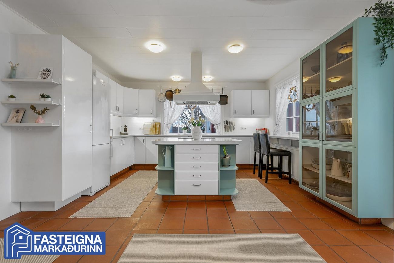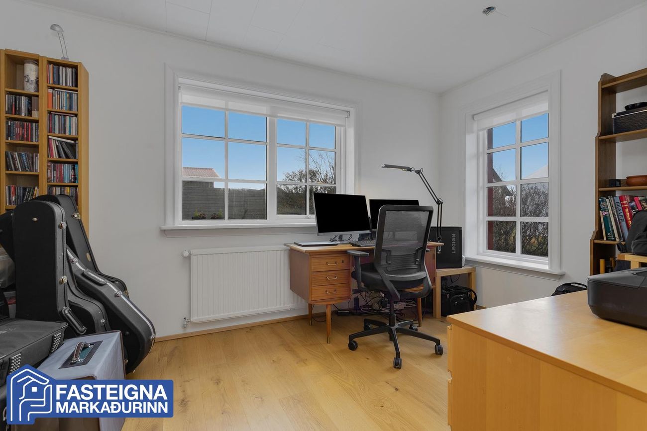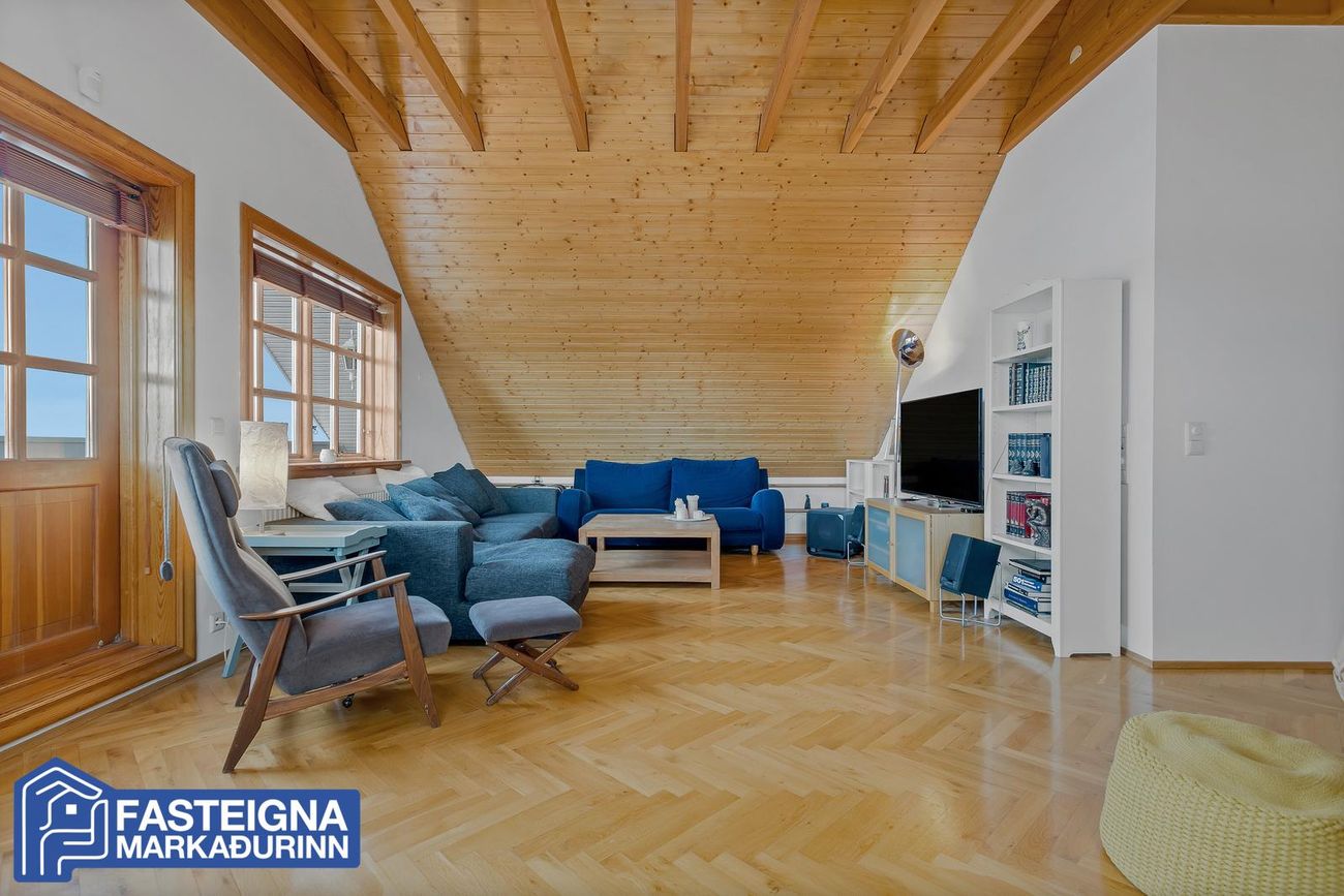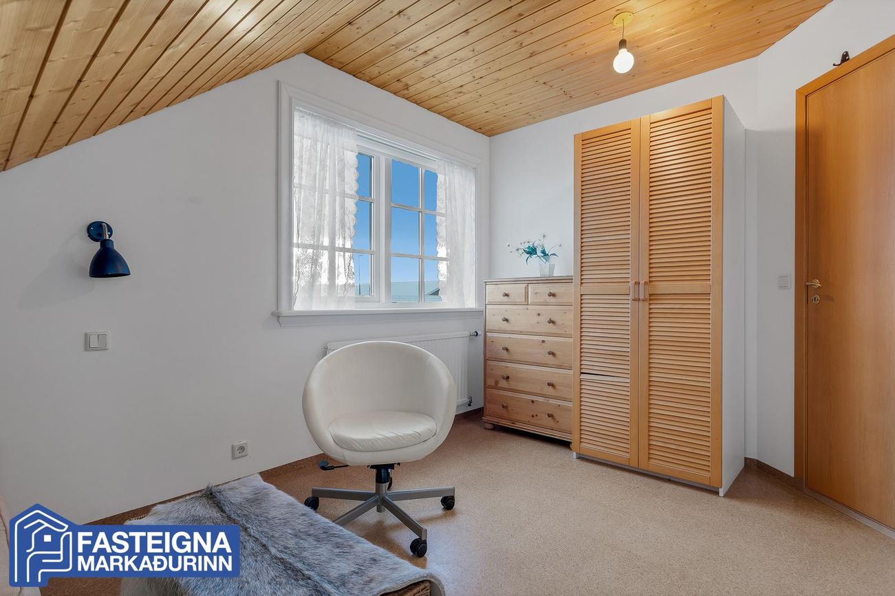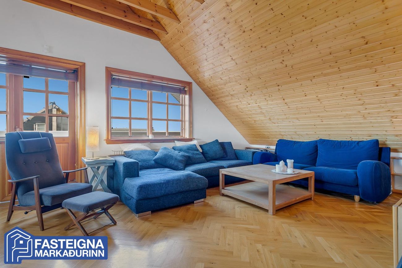 Að innan er húsið virkilega vel skipulagt og mikil lofthæð er á efri hæð þess þar sem eru þrjú svefnherbergi, sjónvarpsstofa og baðherbergi. Á neðri hæð eru m.a. 2 svefnherbergi, eldhús, stofa, borðstofa, sólstofa og þvottaherbergi ásamt gestasnyrtingu.