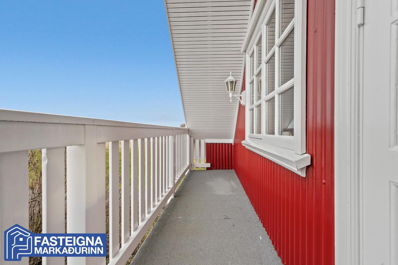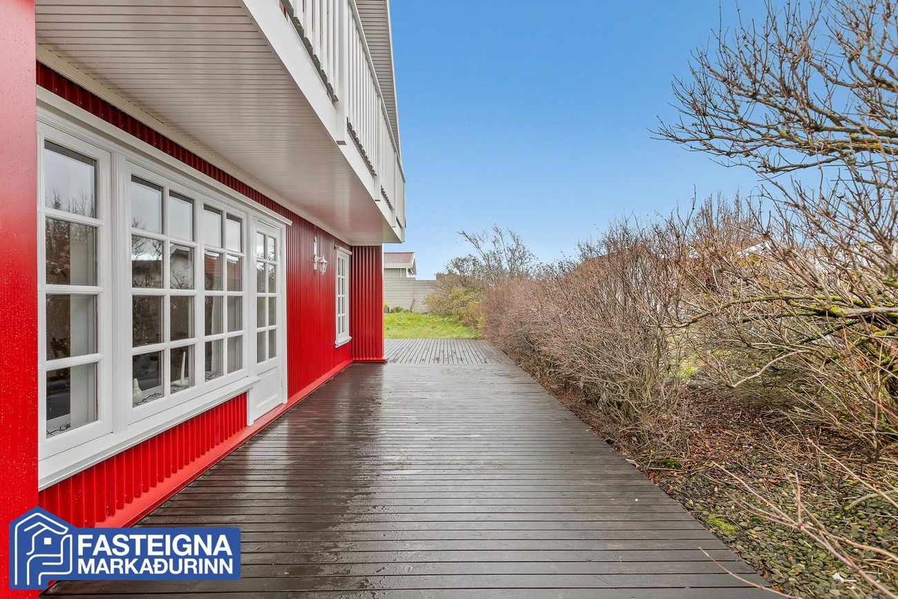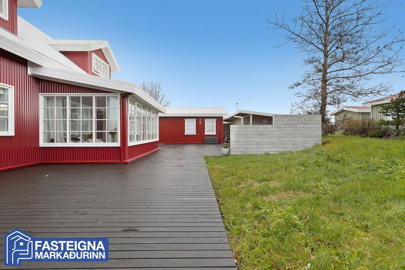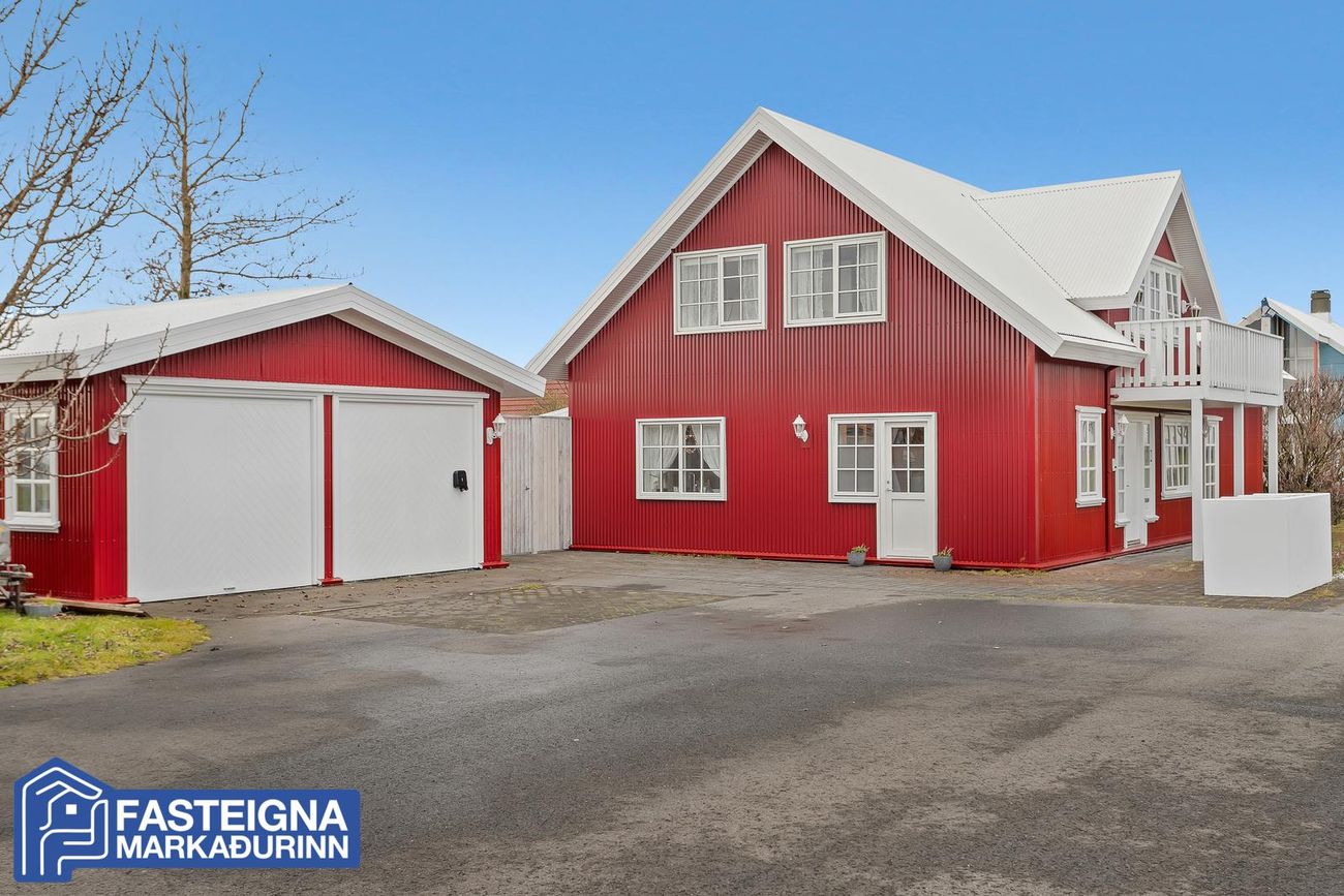Eignin stendur á stórri eignarlóð sem umlykur húsið sem ávallt hefur hlotið gott viðhald og nýlega er búið að endurnýja glugga á austur og suðurhlið hússins, sem og hurðir. Einnig er búið að endurnýja bárujárn á húsinu að mestu leyti og var þakið yfirfarið og málað í sumar. Nýtt þakjárn er á bílskúr og einnig búið að endurnýja bárujárn þar að hluta.Húsið er skv. Fasteignaskrá Íslands skráð 260,0 fermetrar að stærð á tveimur hæðum að meðtöldum tvöföldum 58,0 fermetra bílskúr og skiptist þannig að íbúðarhúsið er 202,0 fermetrar að stærð, bílskúrinn er 58,0 fermetrar og hluti af honum er líkamsræktarherbergi með baðherbergi.