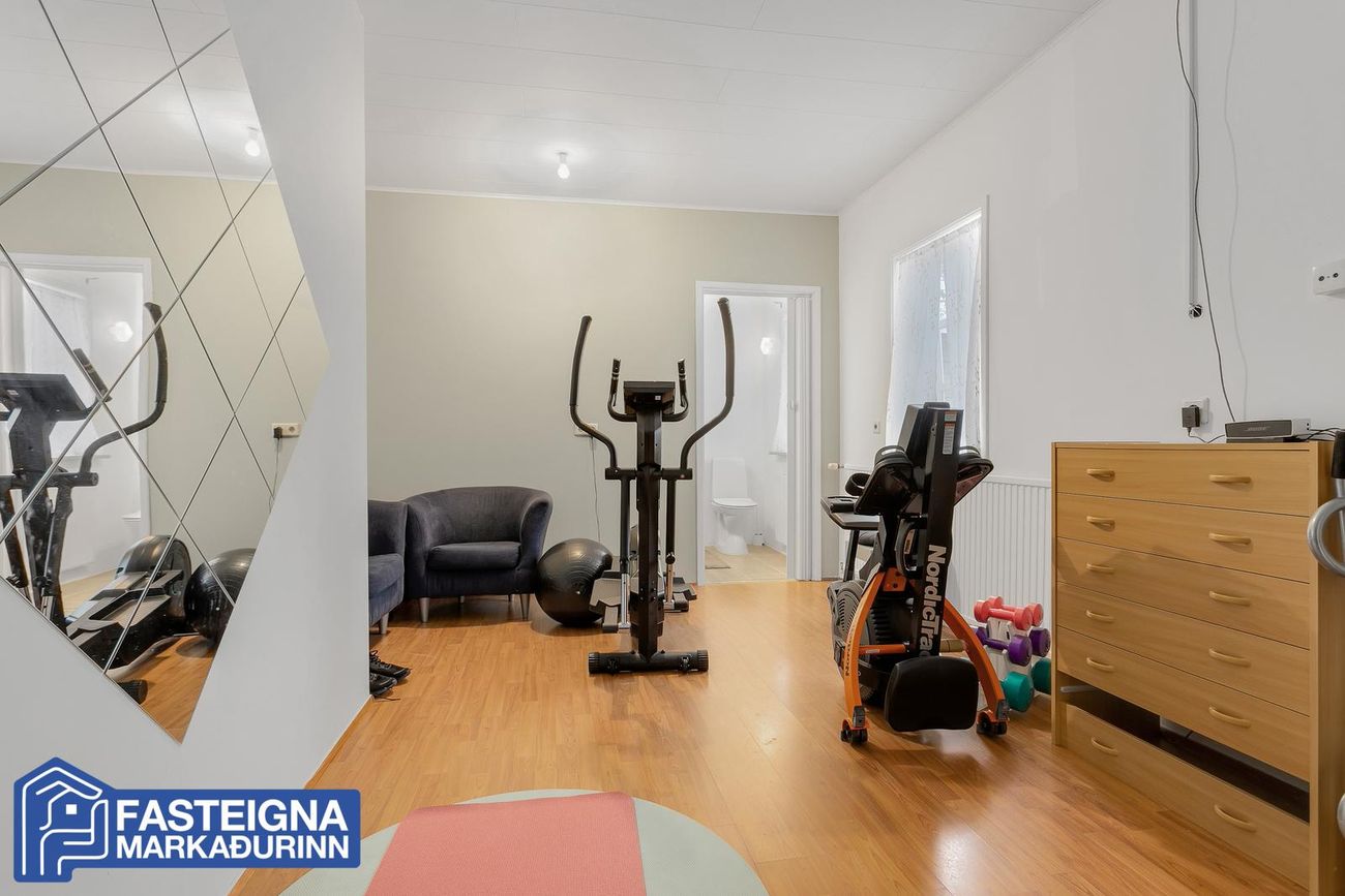 Líkamsrækt, parketlögð og rúmgóð með útgengi á lóð og innangegnt úr bílskúr.