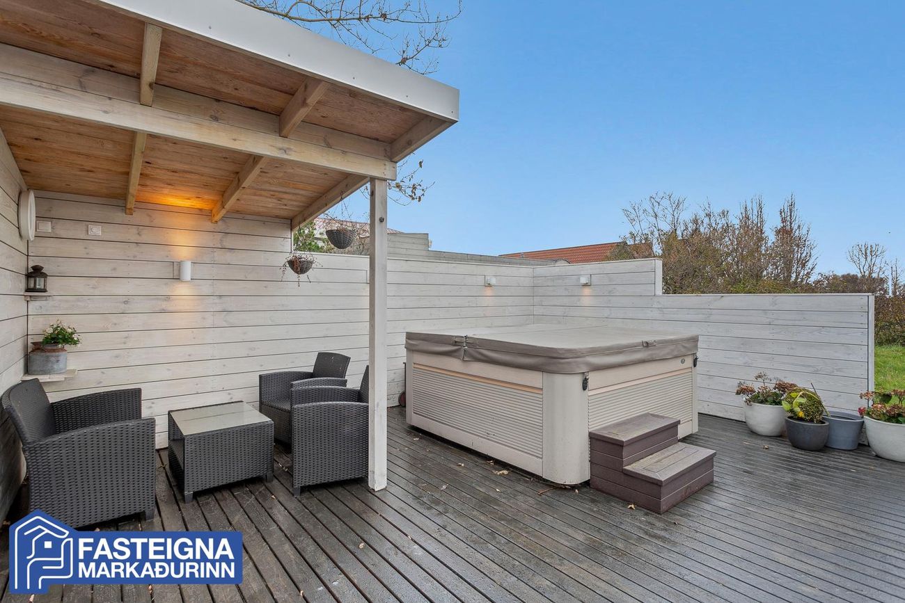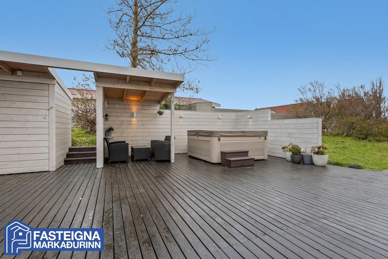 Eignin stendur á 1014,4 fermetra glæsilegri lóð á virkilega fallegum og rólegum stað. Tvennar svalir eru út af efri hæð hússins á vestur og norðurhlið. Gengið er út frá neðri hæð hússins á stóra og skjólsæla viðarverönd sem umlykur suður- og vesturhlið hússins. Viðarveröndin er með saltvatnspotti og geymsluskúrum. Hellulögð stétt og hellulögð innkeyrsla er framan við bílskúr sem rúmar vel fjóra bíla.