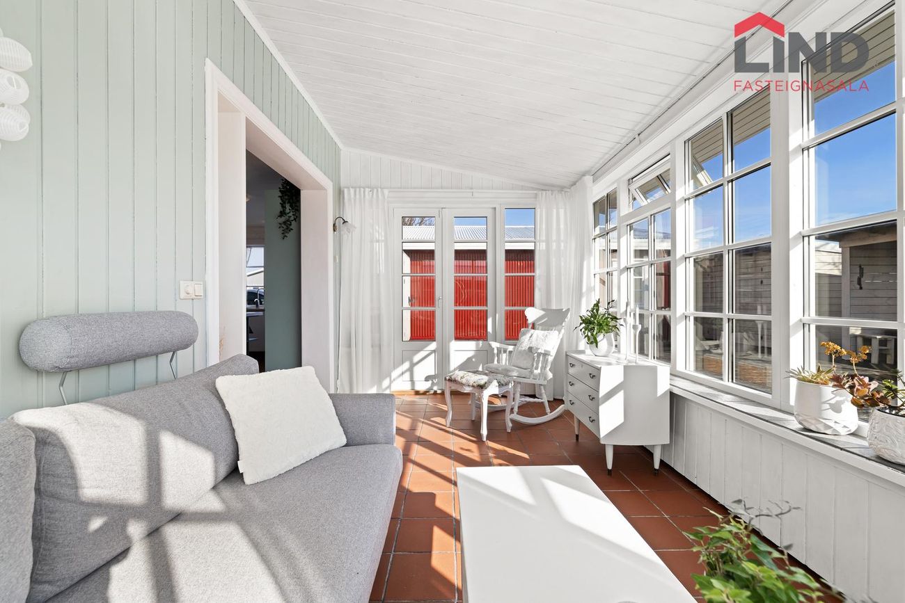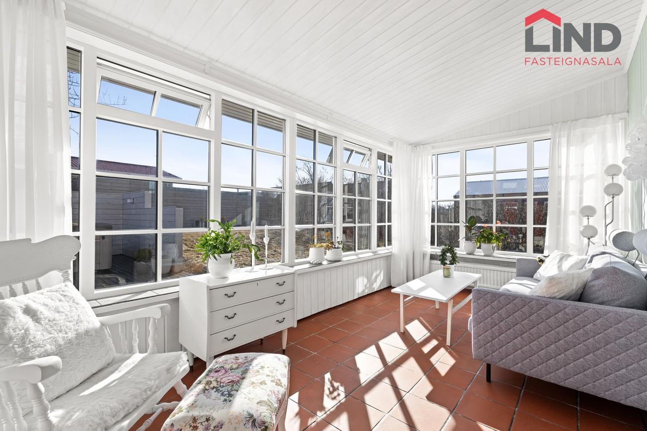 Sólstofa, björt og rúmgóð með flísum á gólfi og útgengi á timburverönd og suðurgarð.