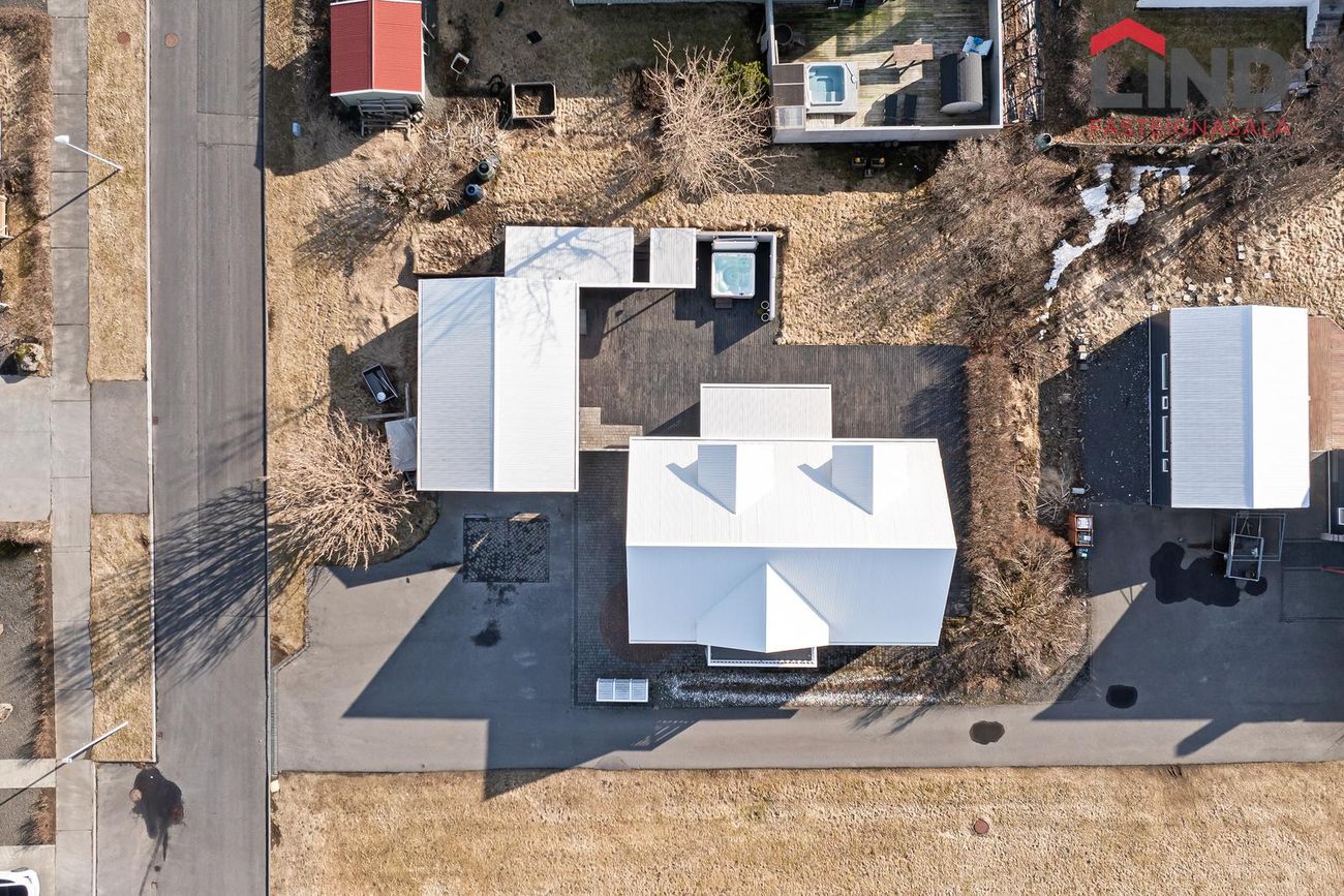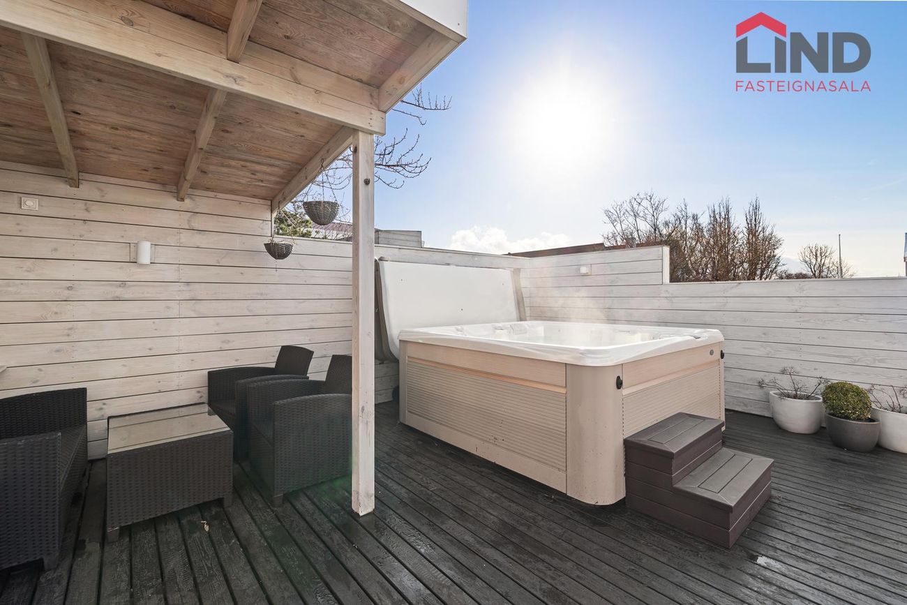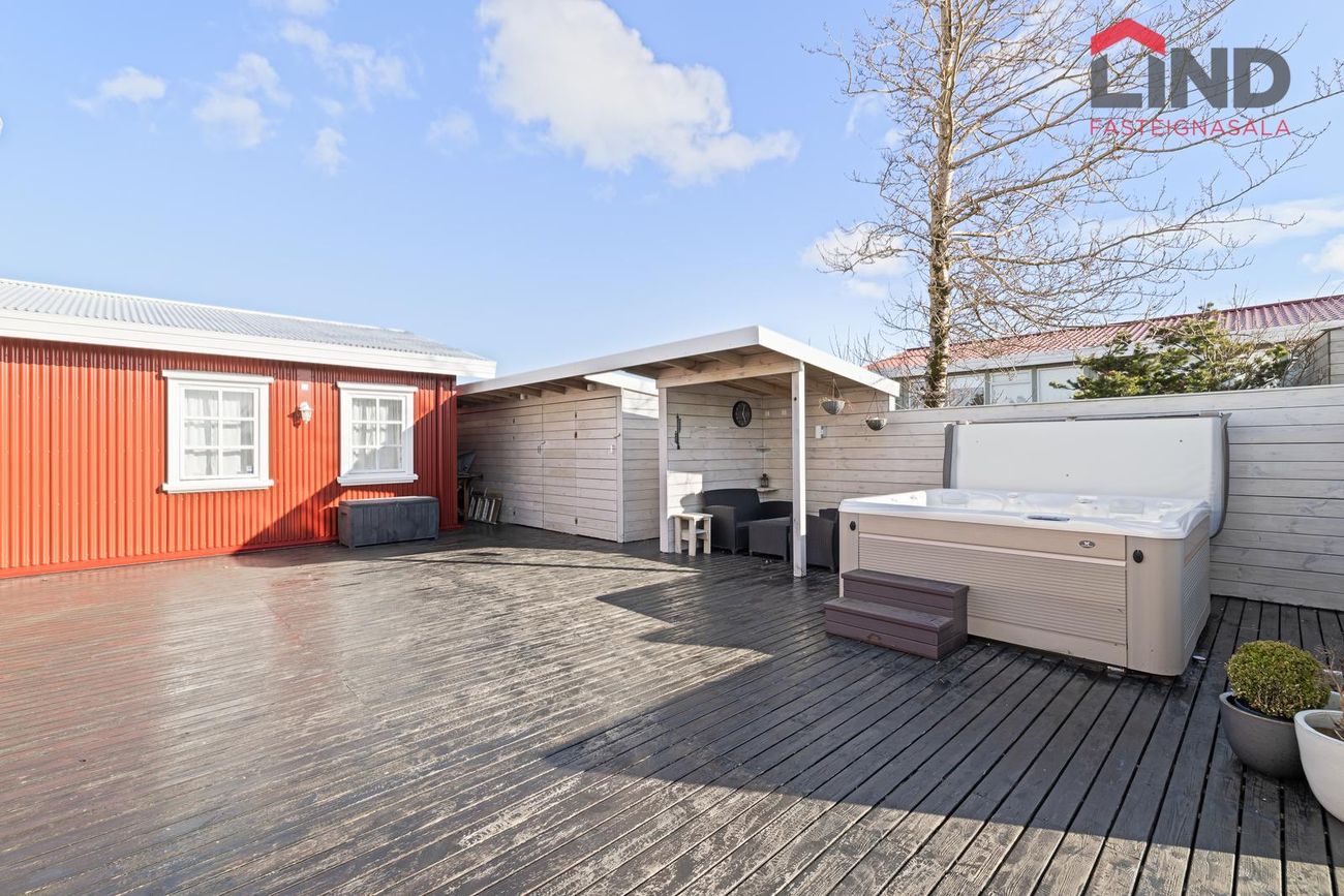 eignarlóð á einstaklega fallegum og rólegum stað. Skjólsæl og rúmgóð viðarverönd umlykur suður- og vesturhlið hússins og er útbúin heitum saltvatnspotti og geymsluskúr. Lóðin er fullfrágengin með hellulagðri stétt og innkeyrslu, góðu bílaplani sem rúmar vel fjóra bíla, auk tyrfðra flata og trjábeða sem gera hana bæði fallega og tiltölulega viðhaldslétta.