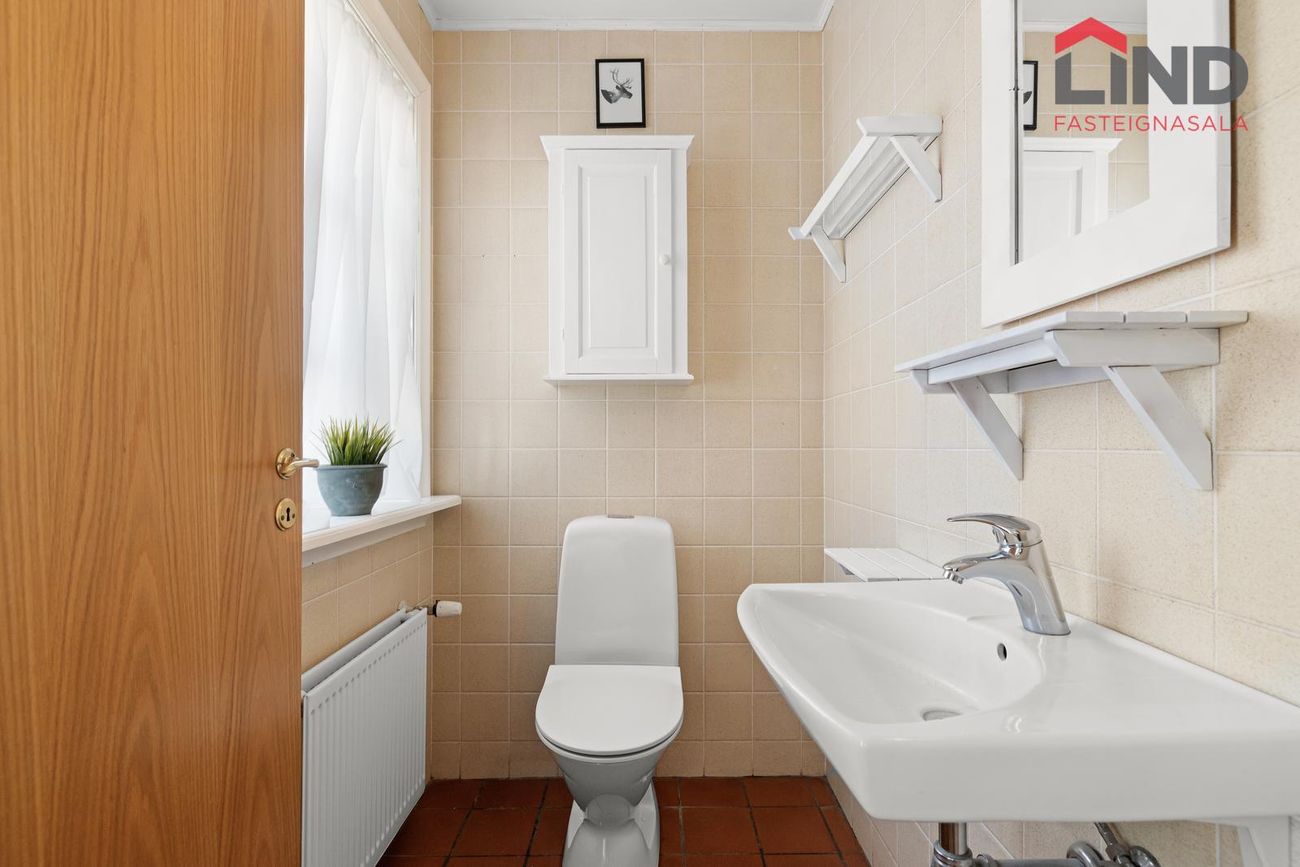 Bílskúr, bjartur og rúmgóður með gluggum, bílskúrshurðum og göngudyrum. Honum hefur verið skipt upp í tvö rými með léttum vegg og útbúið aukaherbergi með baðherbergi sem nýtt er sem
