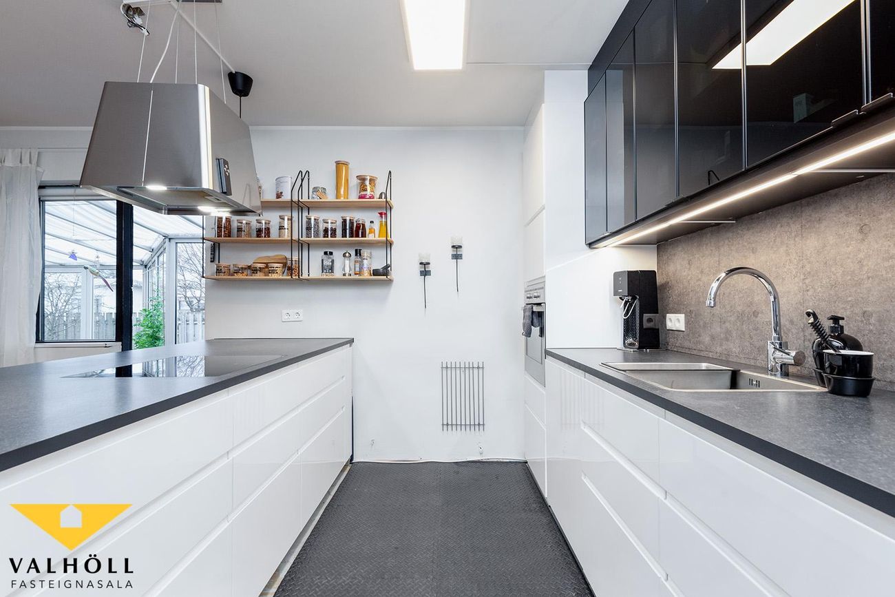Endurnýjað 2019 með hvítum/svörtum glerinnréttingum, stórri eyju með helluborði, hangandi viftu, kaffistöð og tvöföldum ísskáp. Uppþvottavél og ísskápar fylgja mögulega.