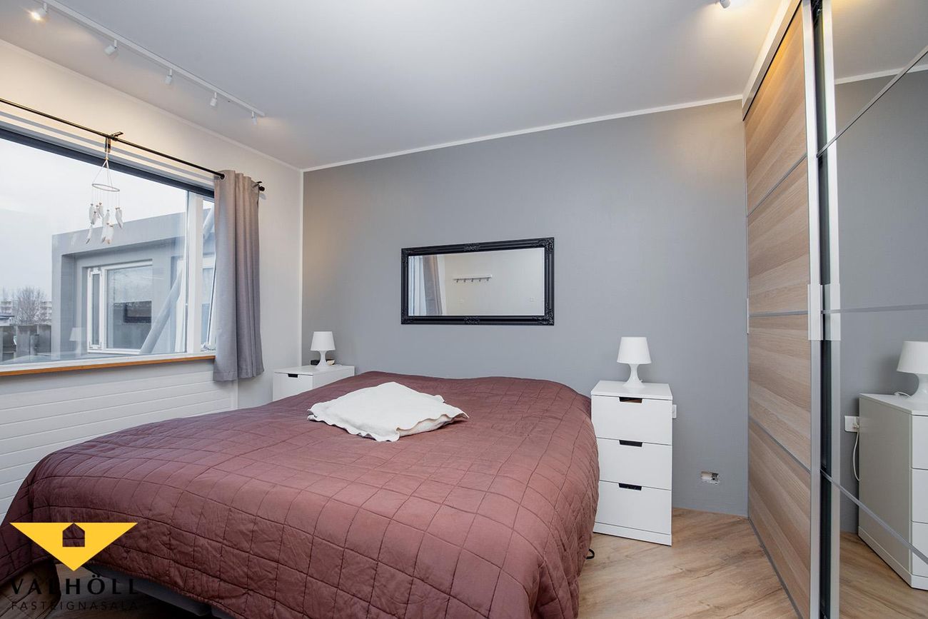 6 svefnherbergi, flest parketlögð með skápum. Hjónaherbergi með nýjum skápum á heilum vegg (2022).