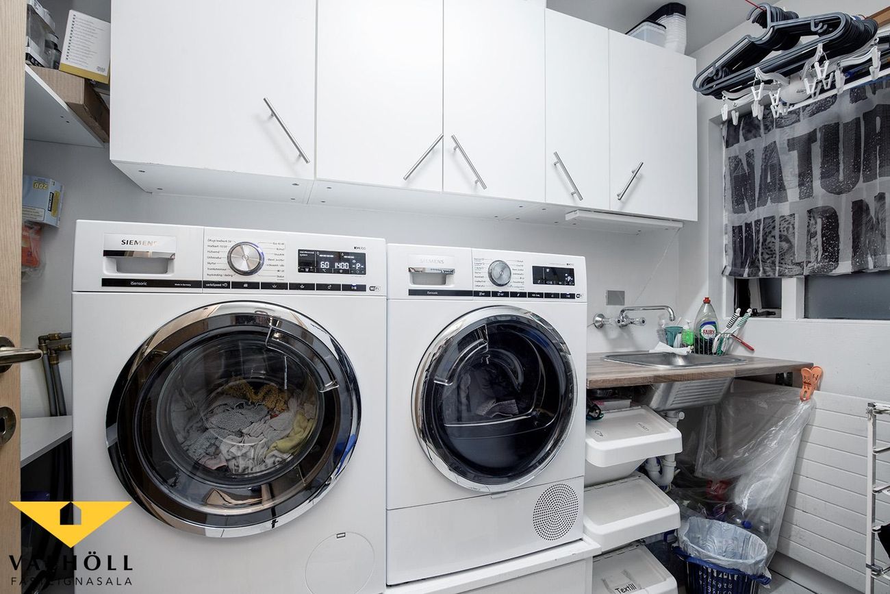 Þvottahús með hvítri innréttingu fyrir þvottavél/þurrkara, vinnuborði og opnanlegum glugga.