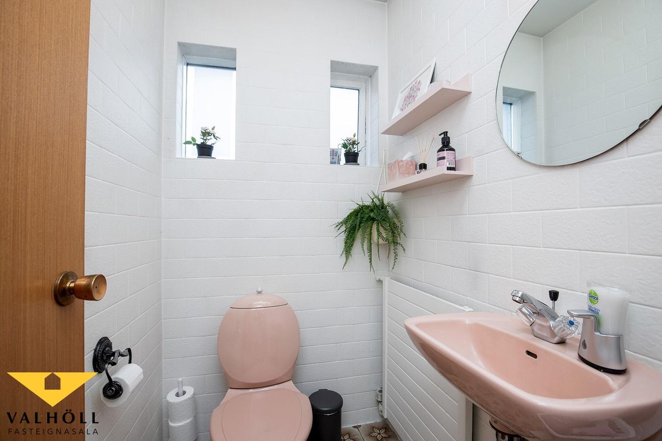 Gestasalerni í forstofu með upprunalegum salernisvask og opnanlegum glugga.