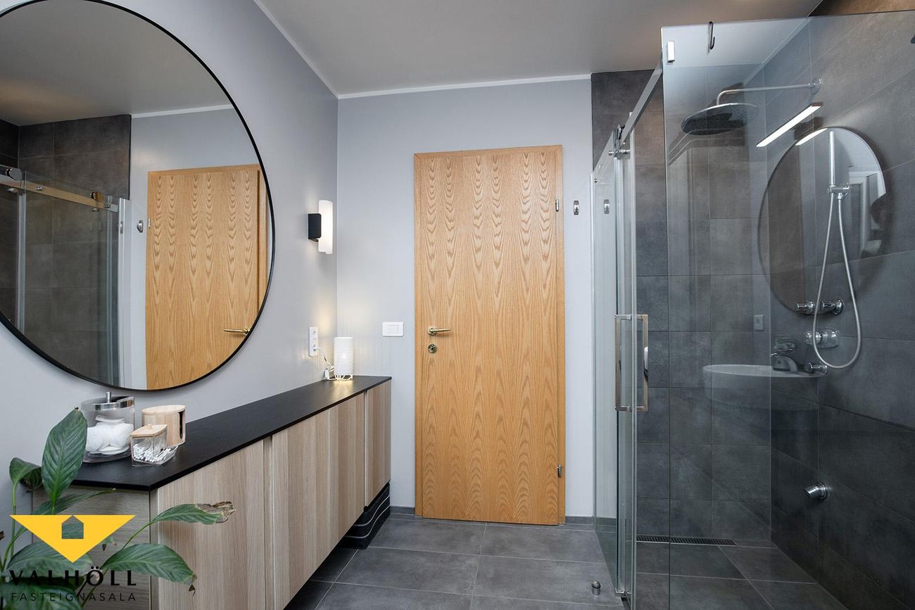 Endurnýjað 2022 með flísum, gólfhita, walk-in sturtu og skápaplássi.