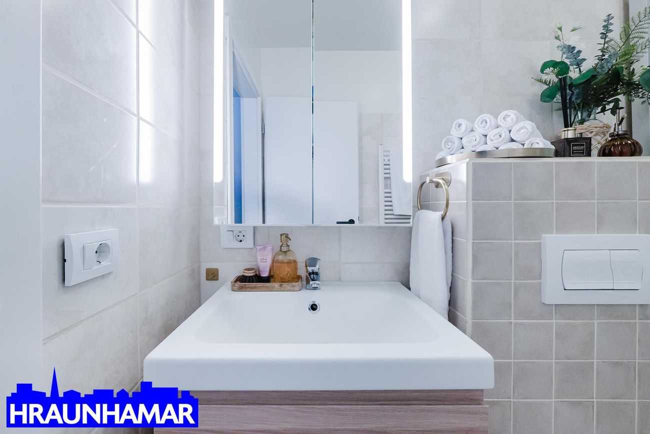 þvottaherbergi innan íbúar. Baðherbergi með flísum í hólf og gólf, baðinnrétting og sturta sem og