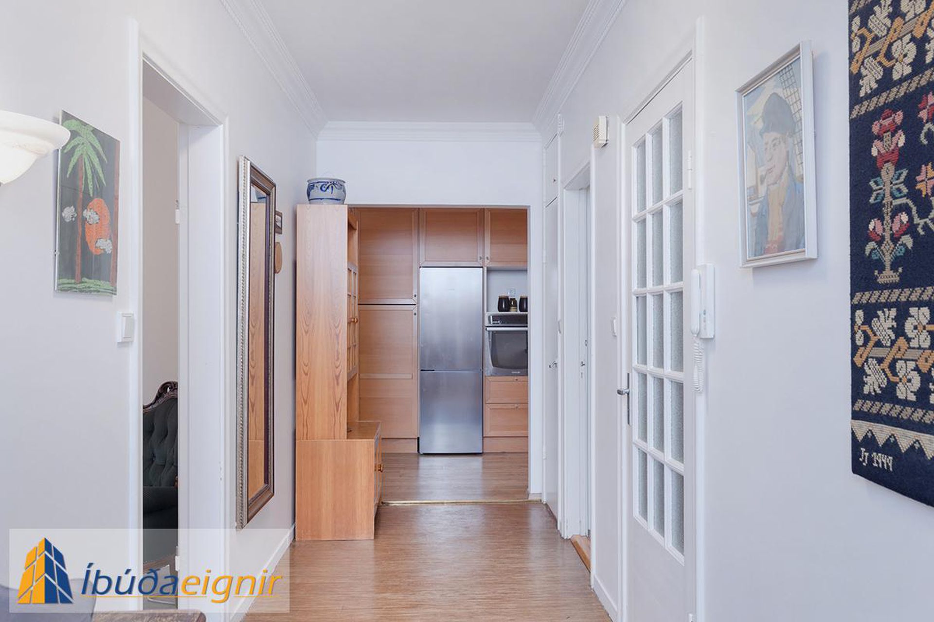 Gangur: Harðparket á gólfi og fataskápur.