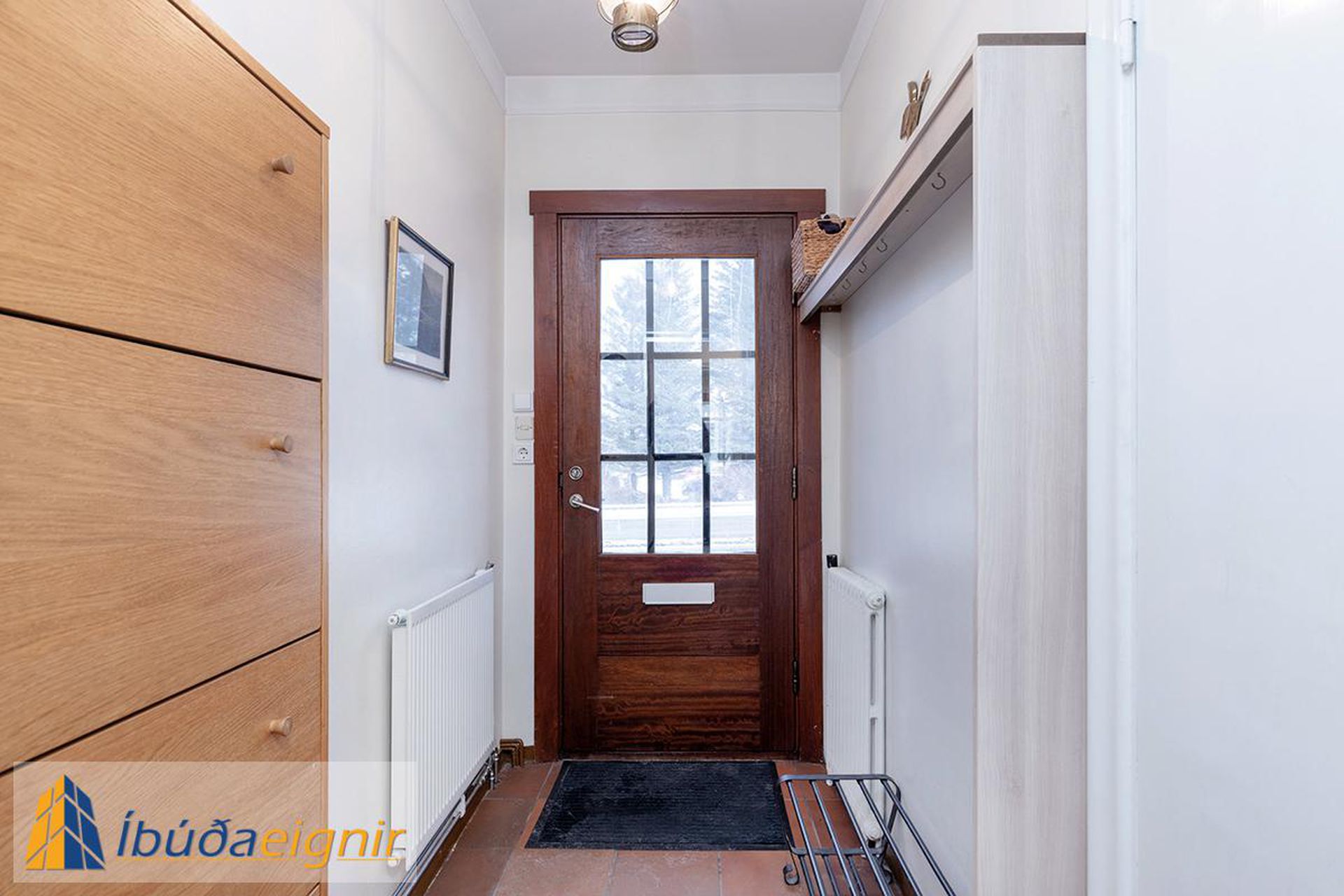 Forstofa: Flísar á gólfi og fatahengi.