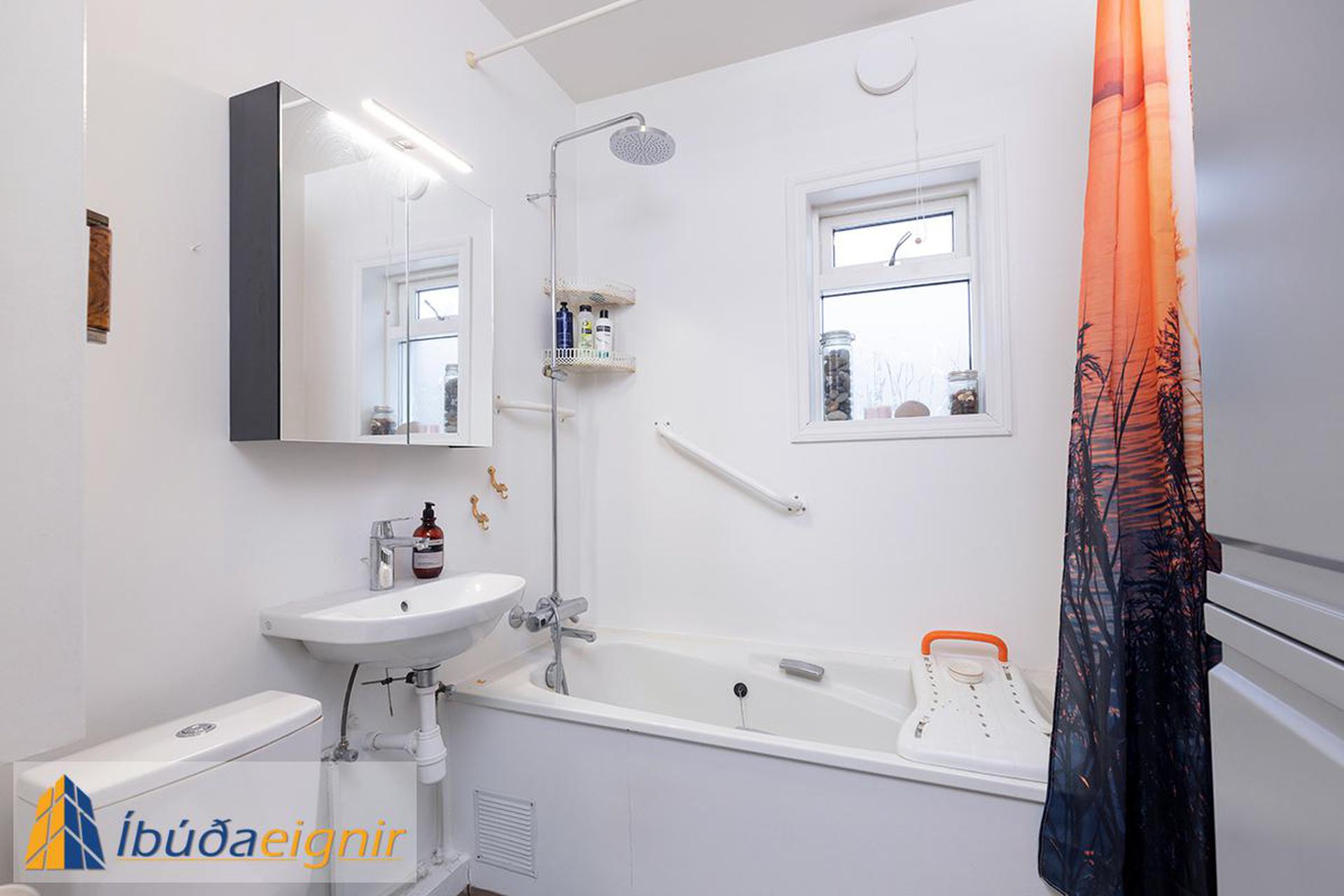 Baðherbergi: Baðkar með sturtuaðstöðu, glerþil, opnanlegum glugga og innbyggðum skáp.