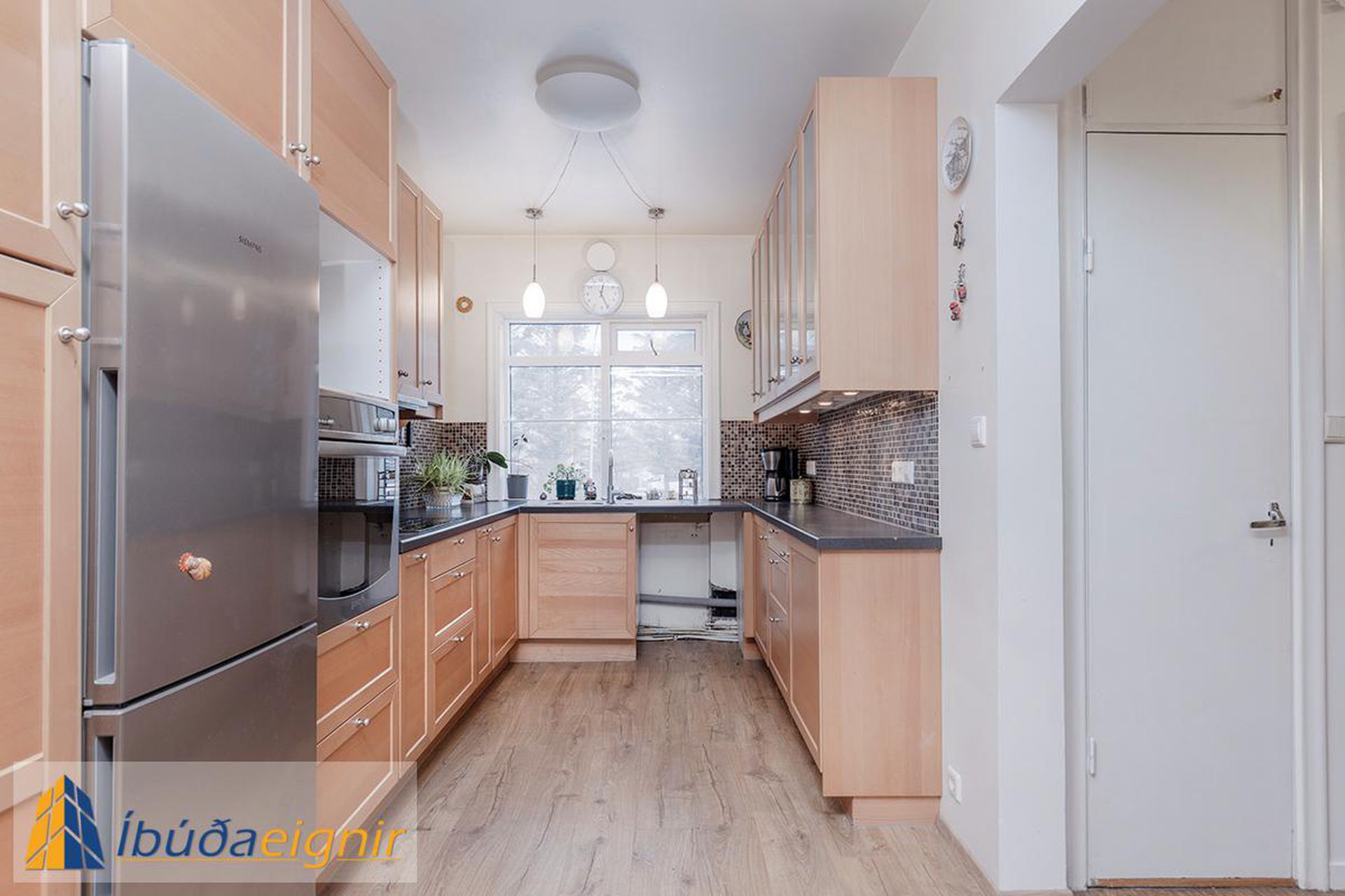 Eldhús: Rúmgott með góðri innréttingu með góðuskápaplássi. Harðparket á gólfi, ofn í vinnuhæð og tengi fyrir uppþvottavél.
