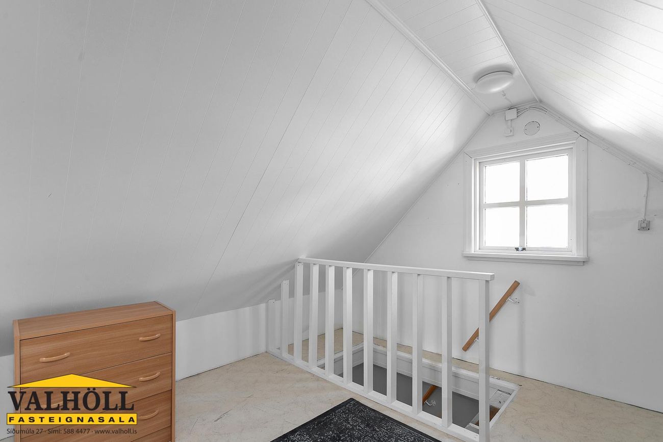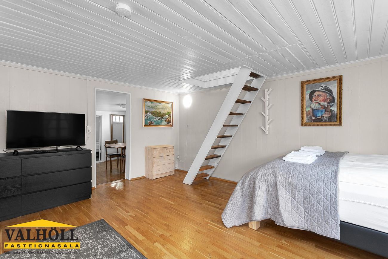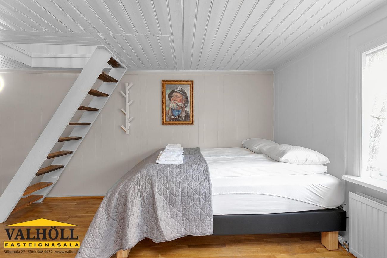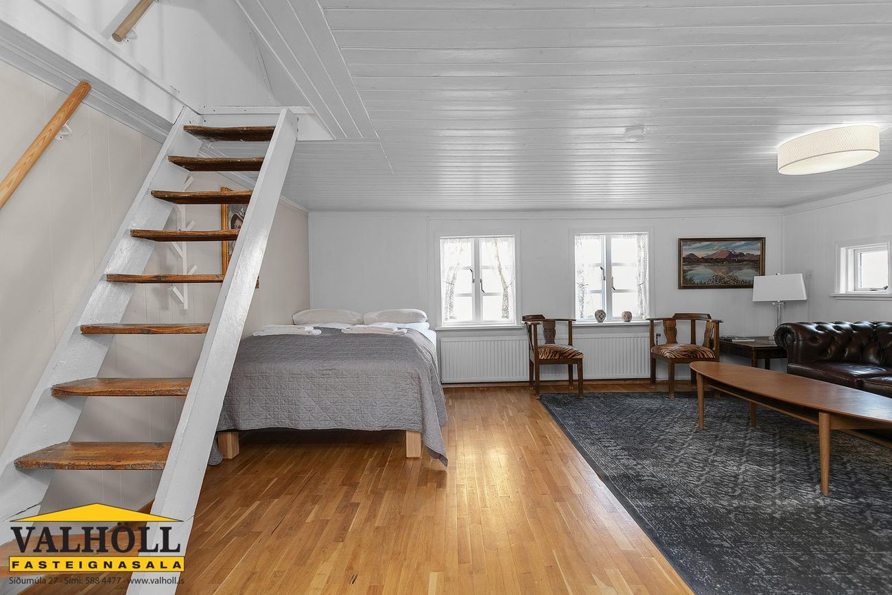 Úr stofu er gengið um timburstiga upp á loft sem er yfir hluta hússins, sem hefur nýtt er sem svefnherbergi.