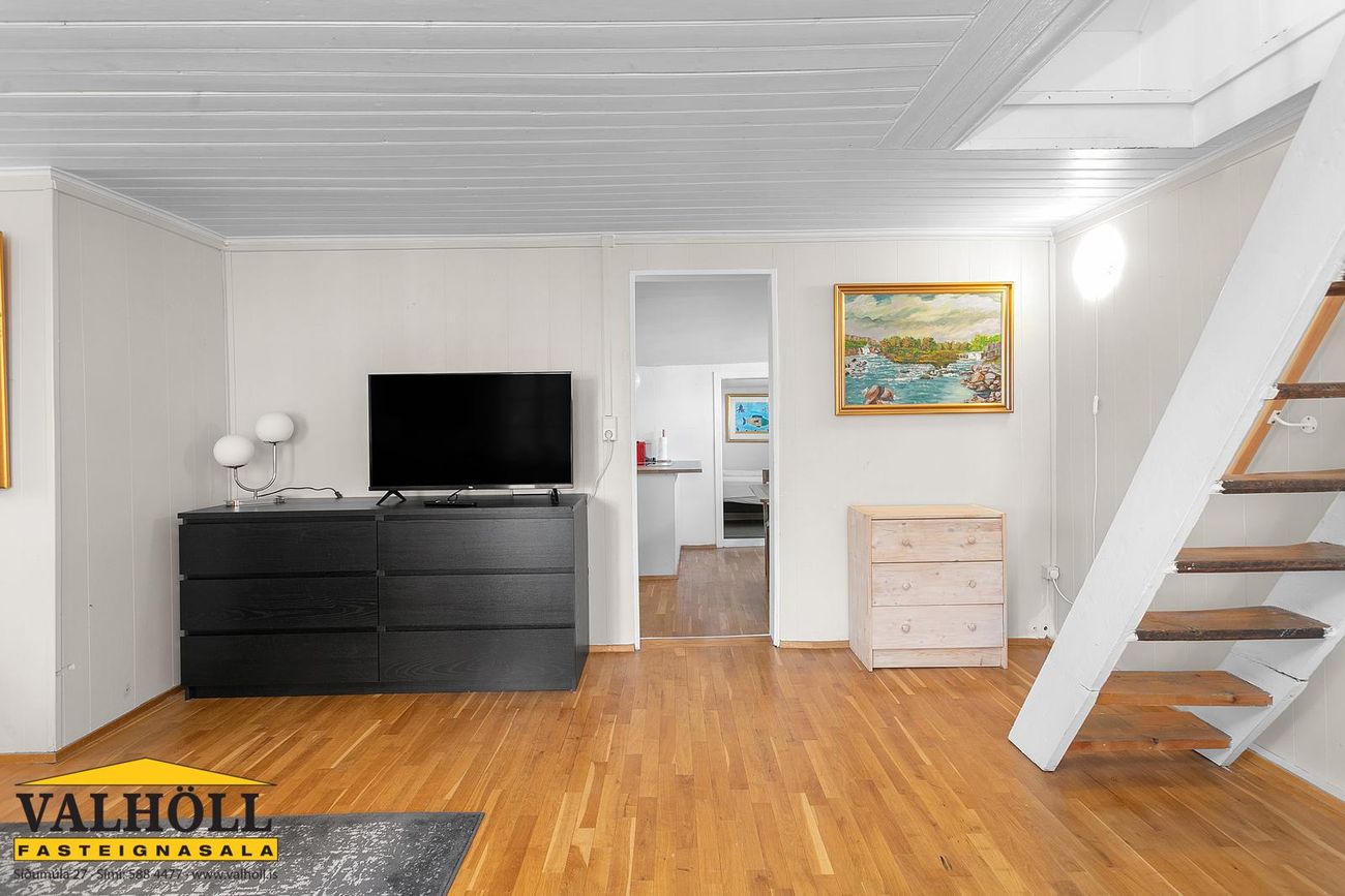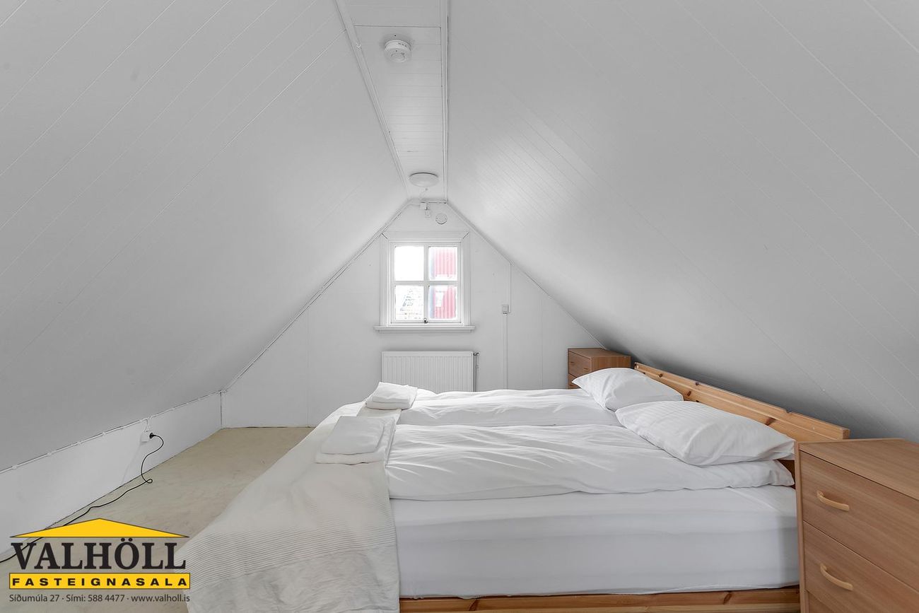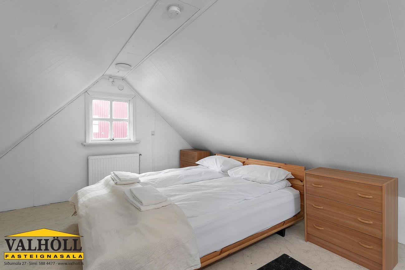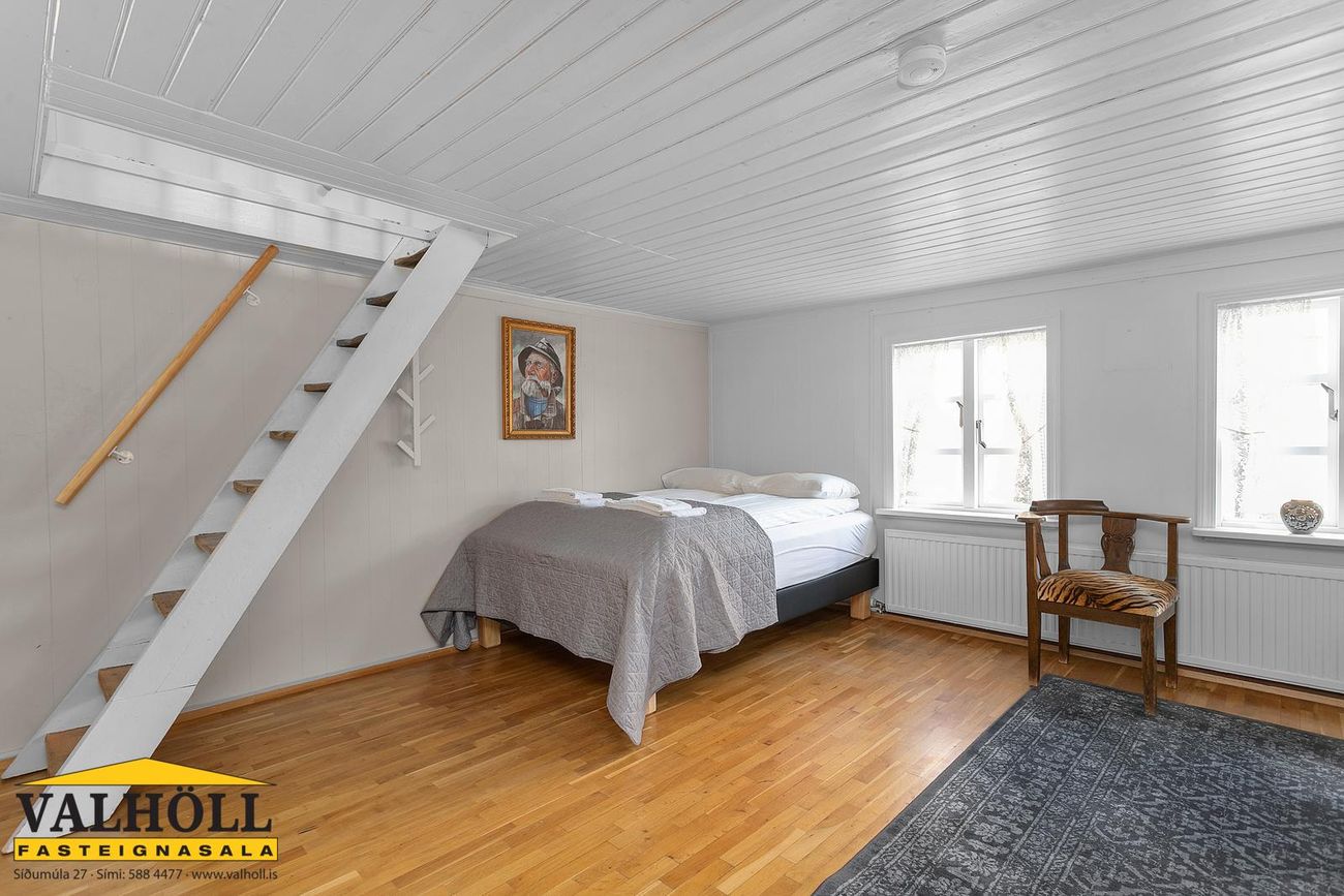 Úr stofu er gengið um timburstiga upp á loft sem er yfir hluta hússins, sem hefur nýtt er sem svefnherbergi.