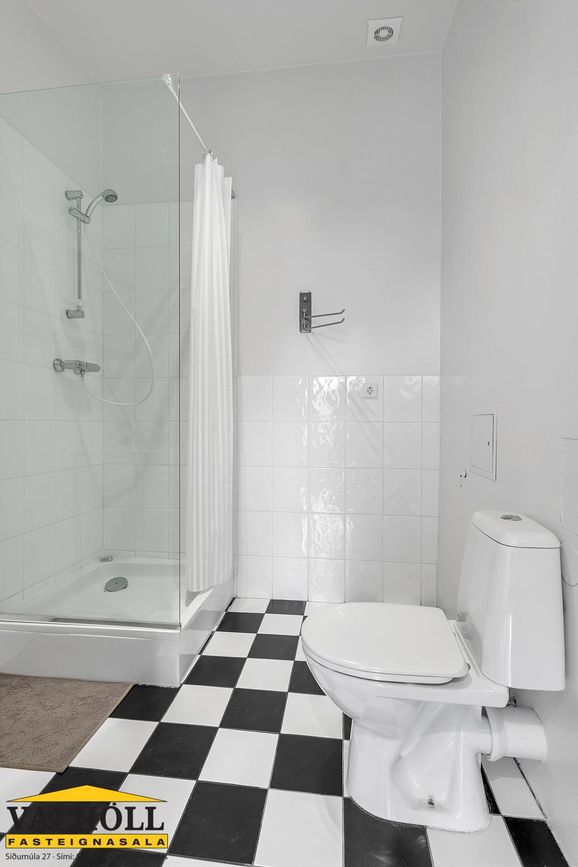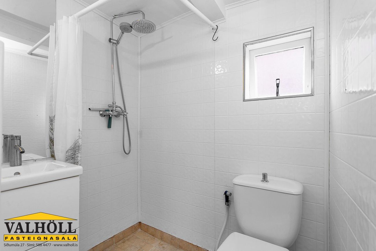 Baðherbergi: Flísar á veggjum og gólfi, sturta, gluggi.