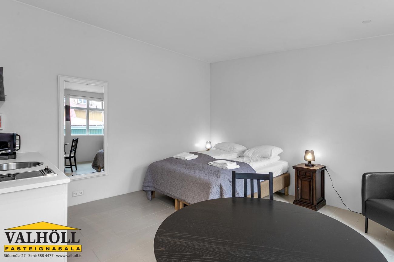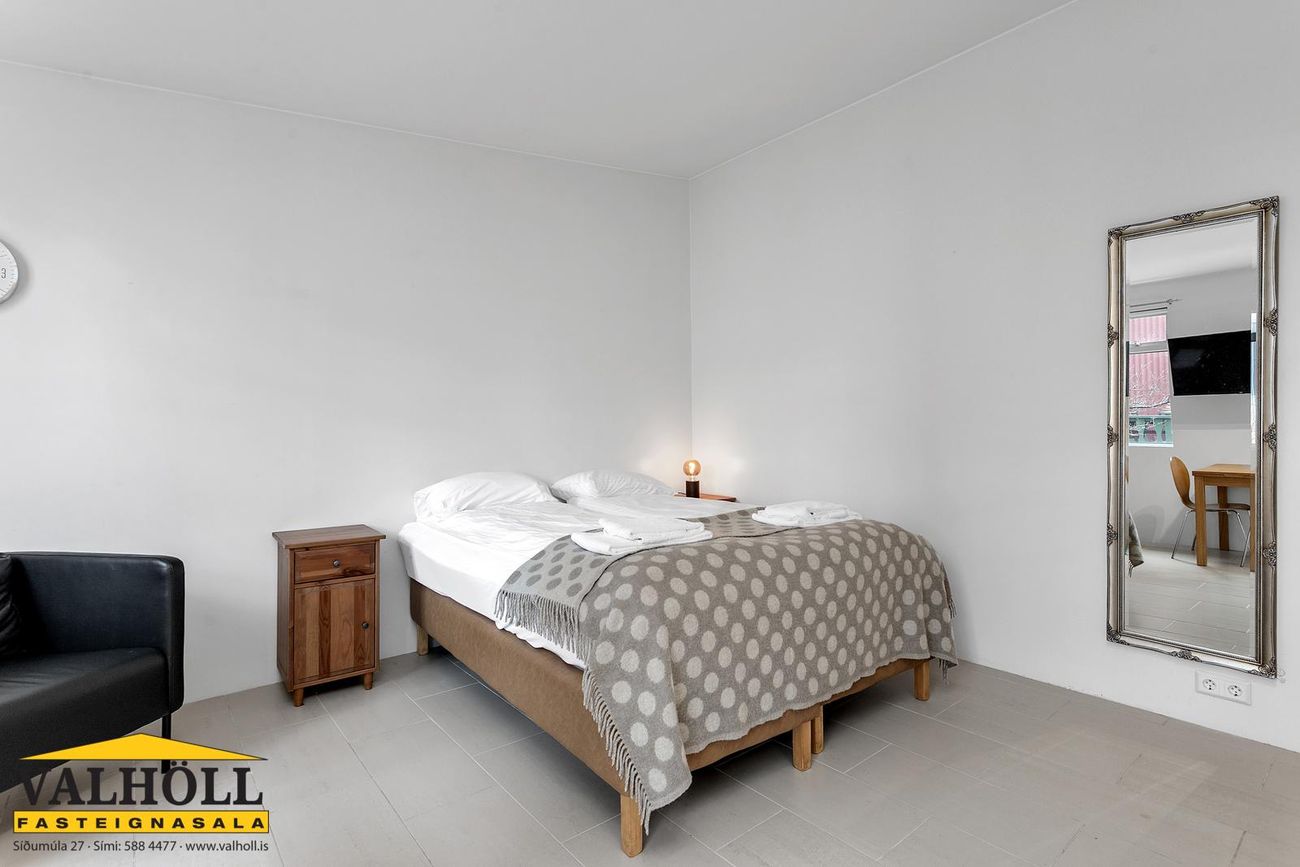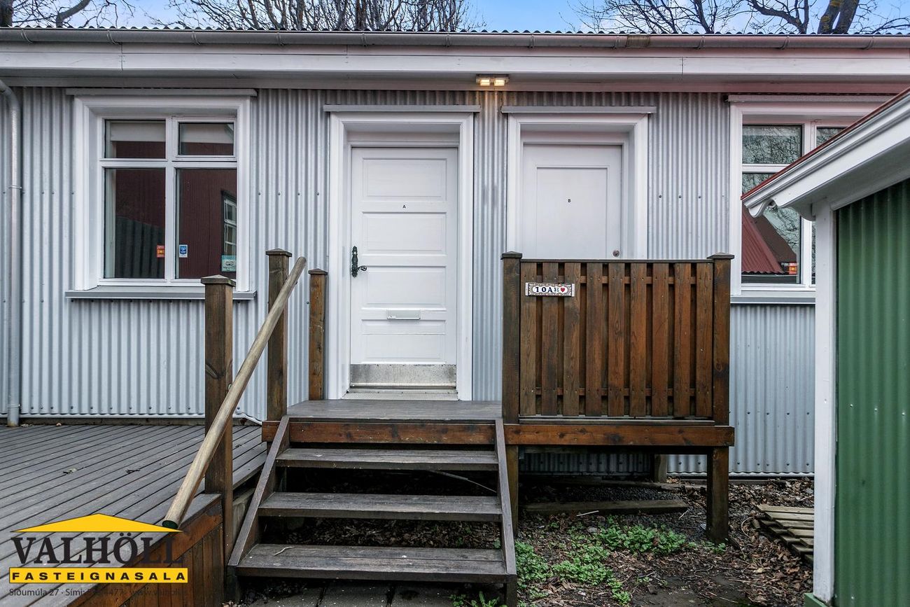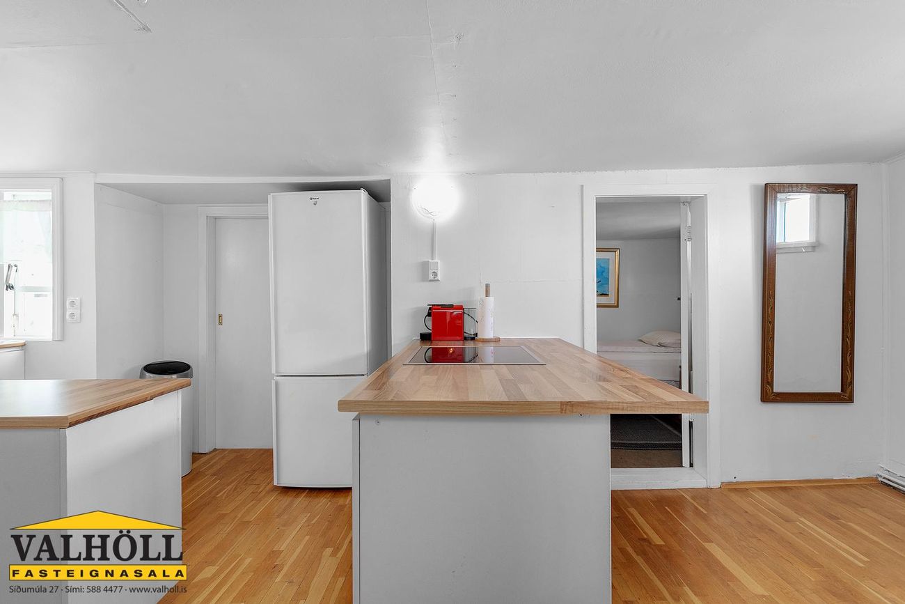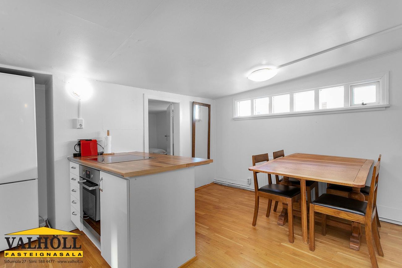 Bakhúsið er bárujárnsklætt og hefur verið skipt upp í tvær nýlega innréttaðar stúdíó íbúðir hvor með sér baði og sér eldhúsinnréttingu. Góður sólpallur er fyrir framan húsið.