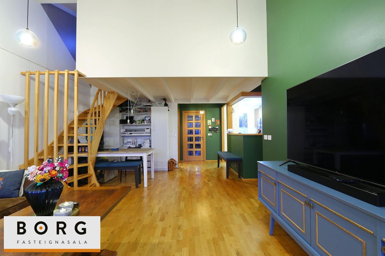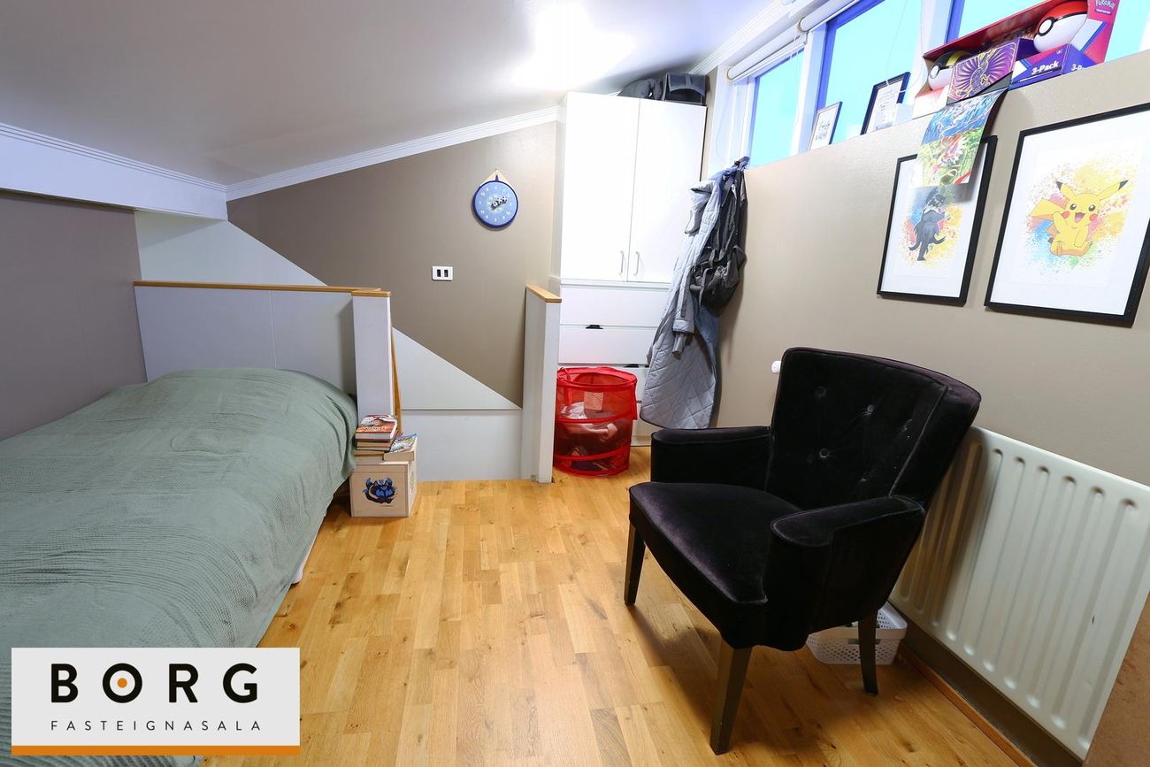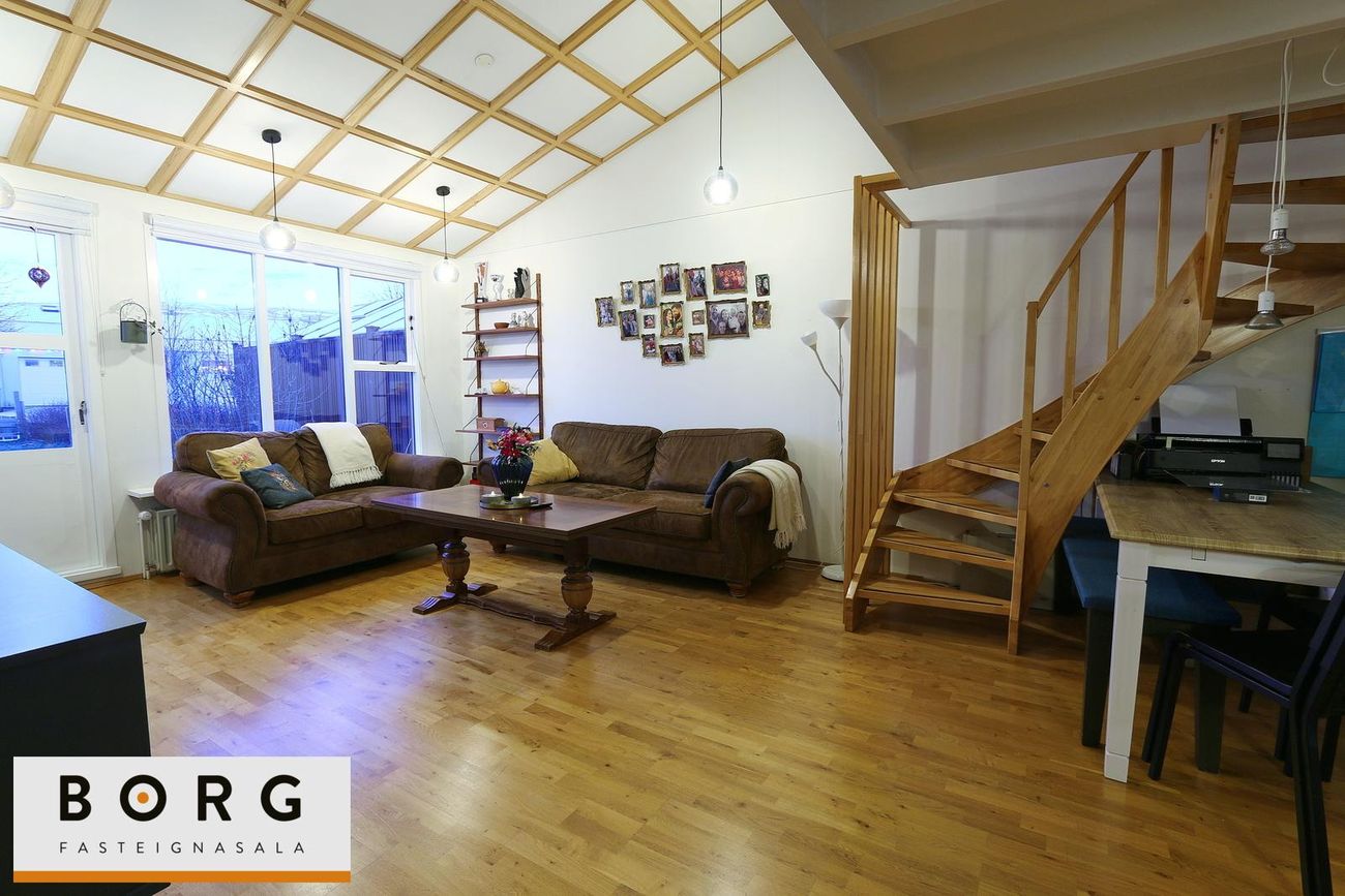 Raðhús með 3 svefnherbergjum innan íbúðar og 4. herbergi ofan á hluta stofunnar. Inngangur um bílskúr með þvottaaðstöðu og búrgeymslu.
