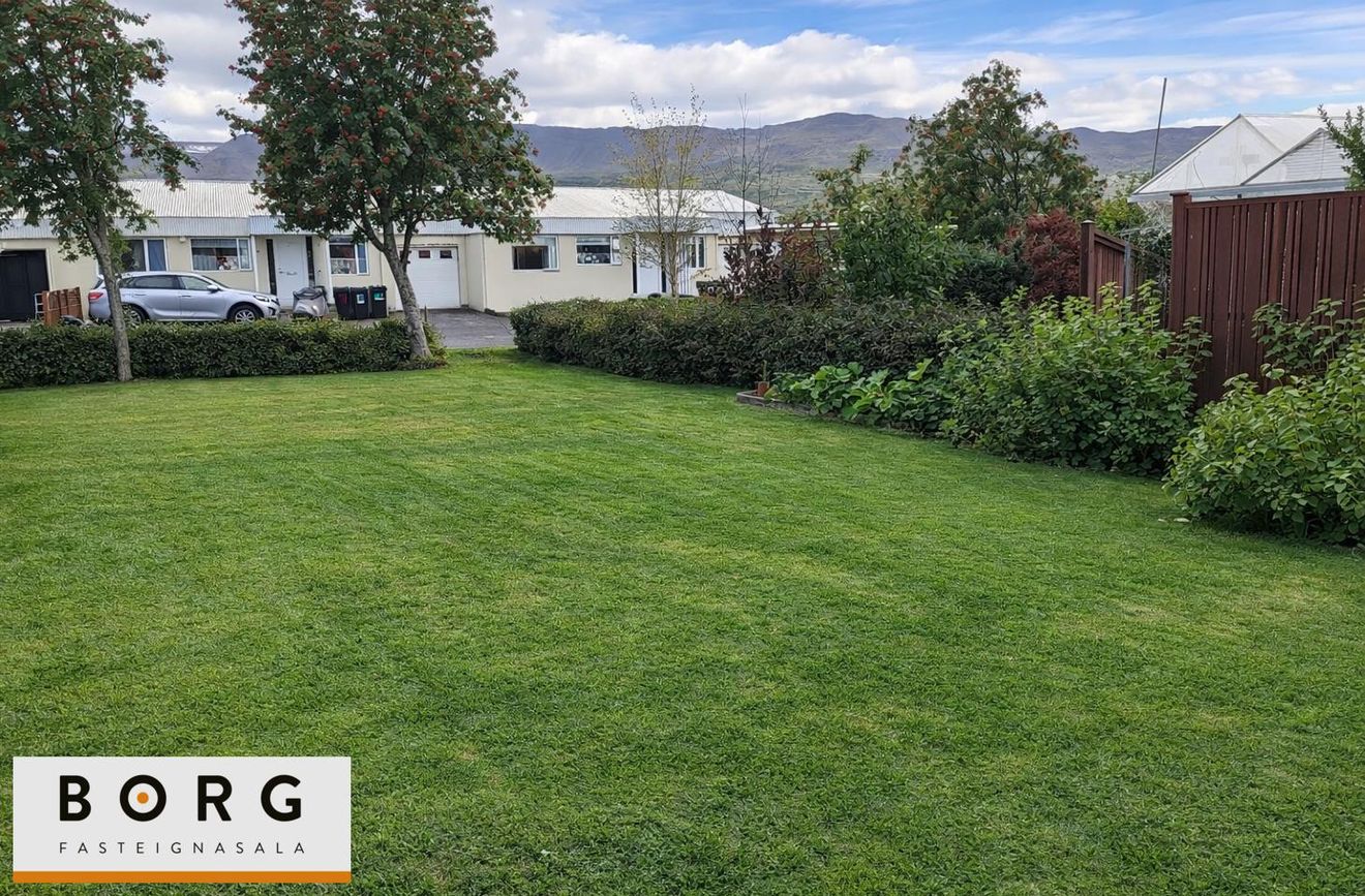 Stór lóð til vesturs með nýlega jöfnuðu túnþaki og gróðurhúsi.