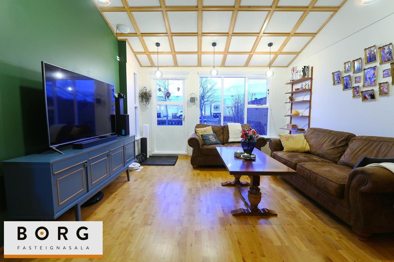 Rúmgóð stofa með parketgólfi og útgang á stóra vesturlóð með nýlega jöfnuðu túnþaki.