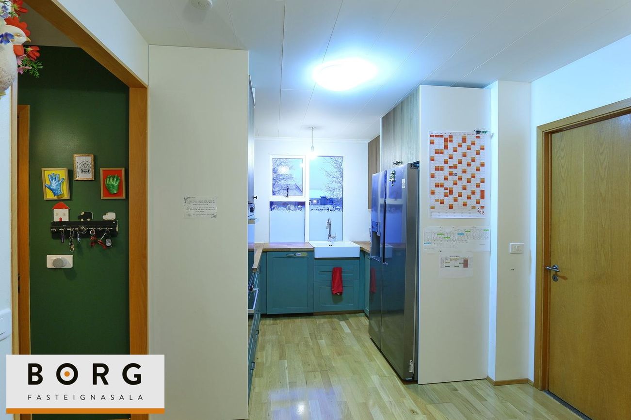 4 svefnherbergi, 33,9 m² bílskúr breyttur í stúdíóíbúð, tengingar fyrir rafbíl, ljósleiðari, barnvænt umhverfi.
