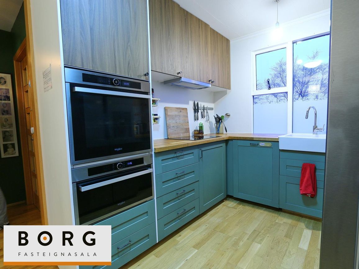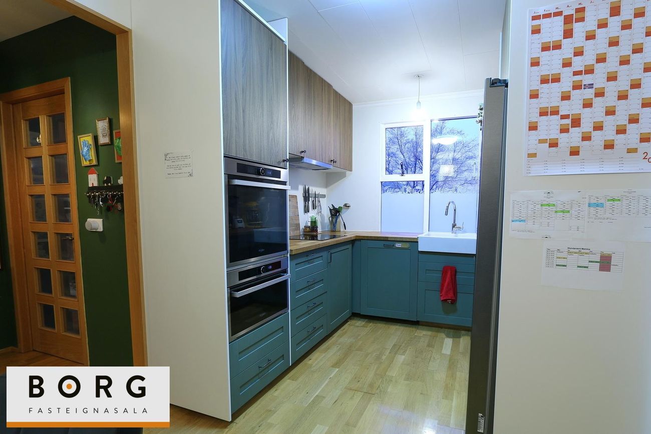 Nýleg innrétting með efri- og neðri skápum, parketgólf og ágætis borðkrók.