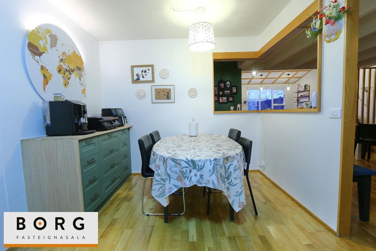 Innbyggður bílskúr (33,9 m²) breyttur í stúdíóíbúð með eldhús og baðherbergi. 4 bílastæði frammi við hús.