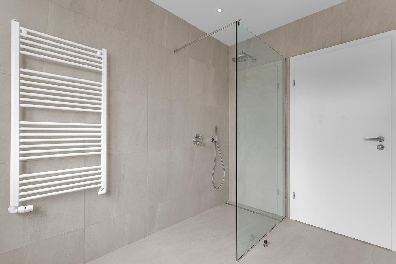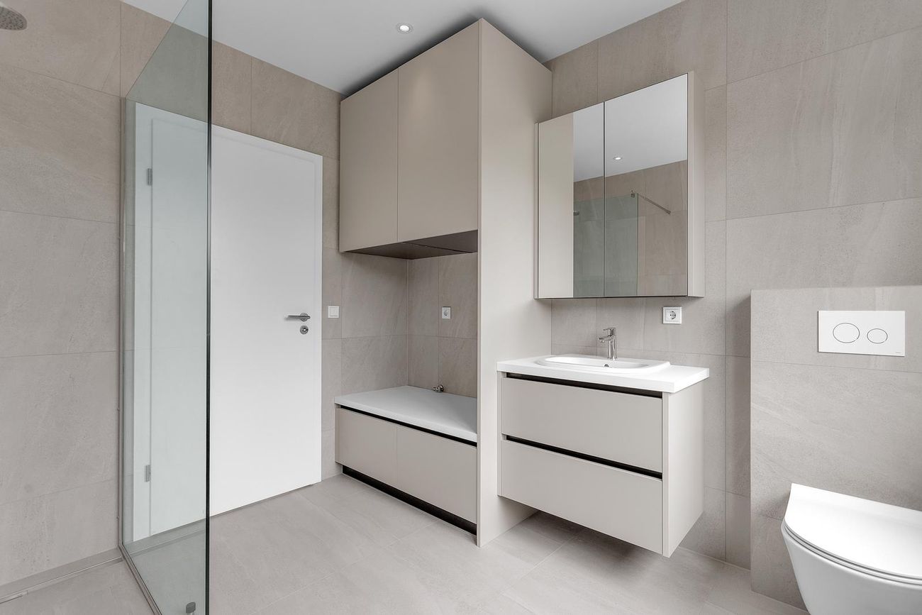Tvö baðherbergi með flísalögðum gólfum og hólfum, nútímalegum útistandandi sturta.