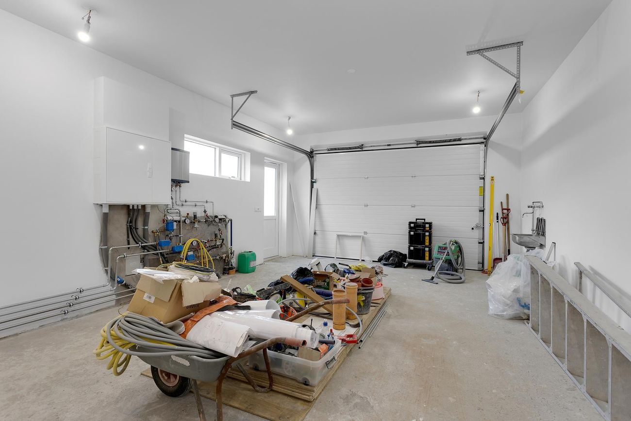 39,4 m² bílskúr með sérsniðnum hurðum úr timbri og álkant.