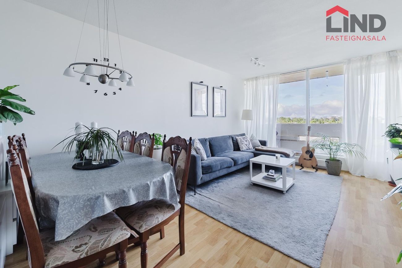 borðastofan mynda opið og bjart rými með gólfsíðum gluggum, parket á gólfi og útgengt á svalirnar til vesturs.