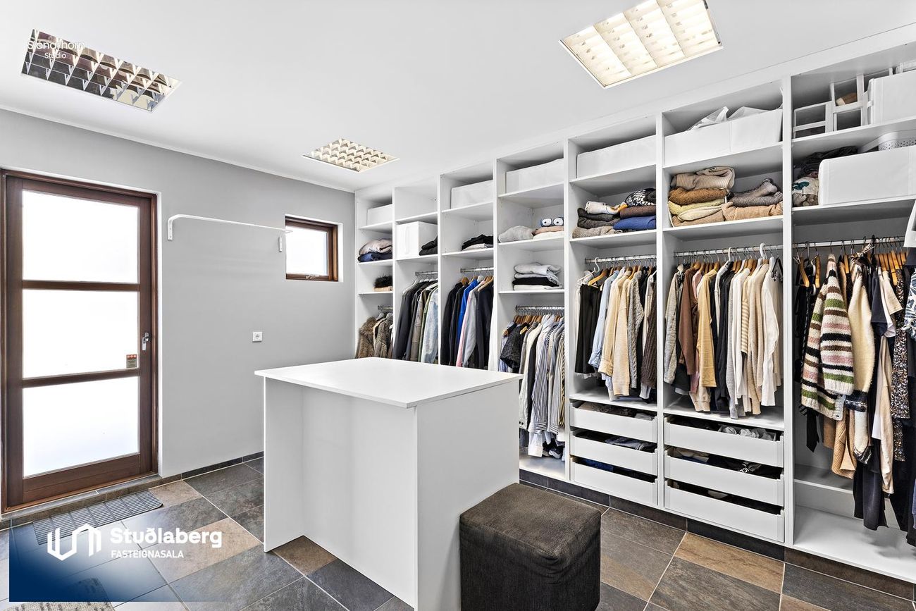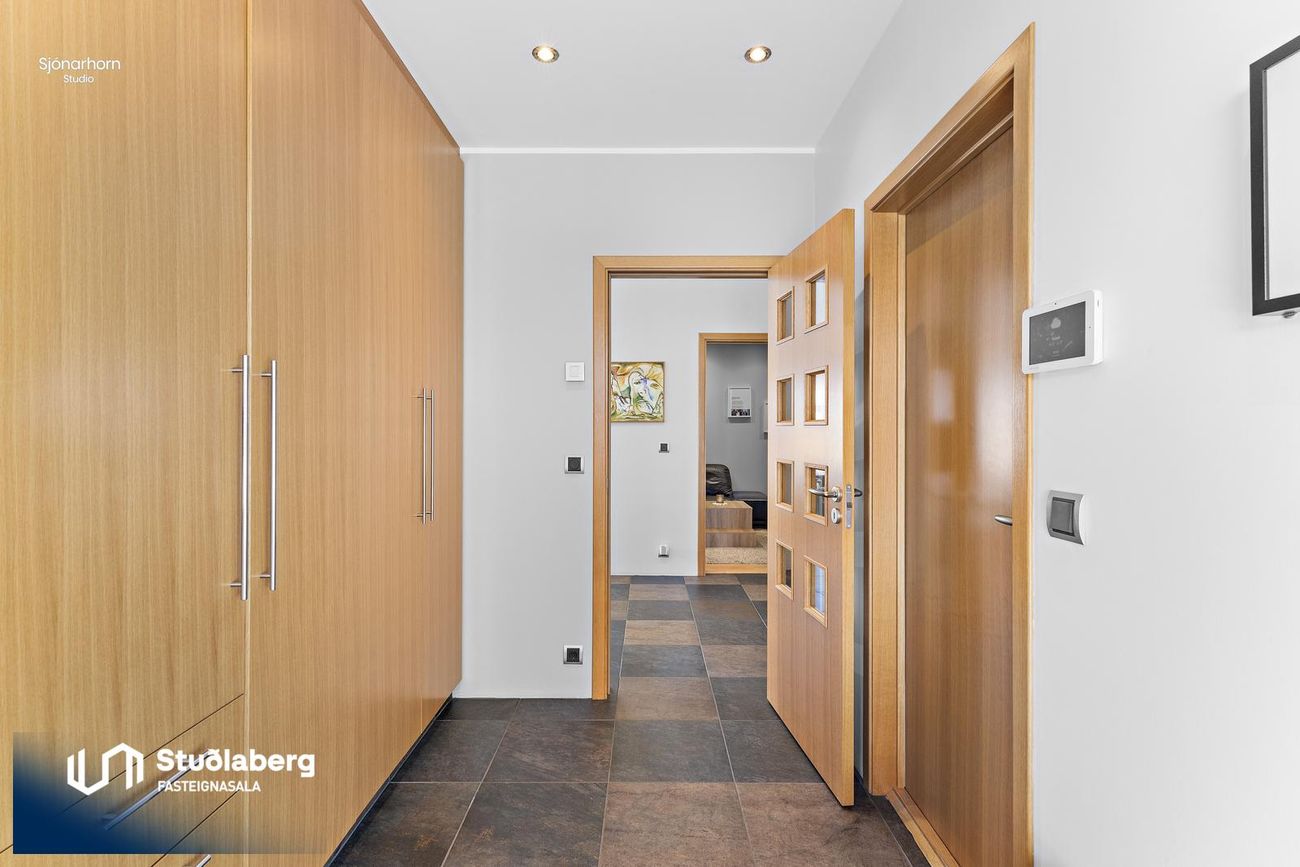 Forstofa er flísalögð, þar er góður fataskápur, innangengt er bílskúr frá forstofu.