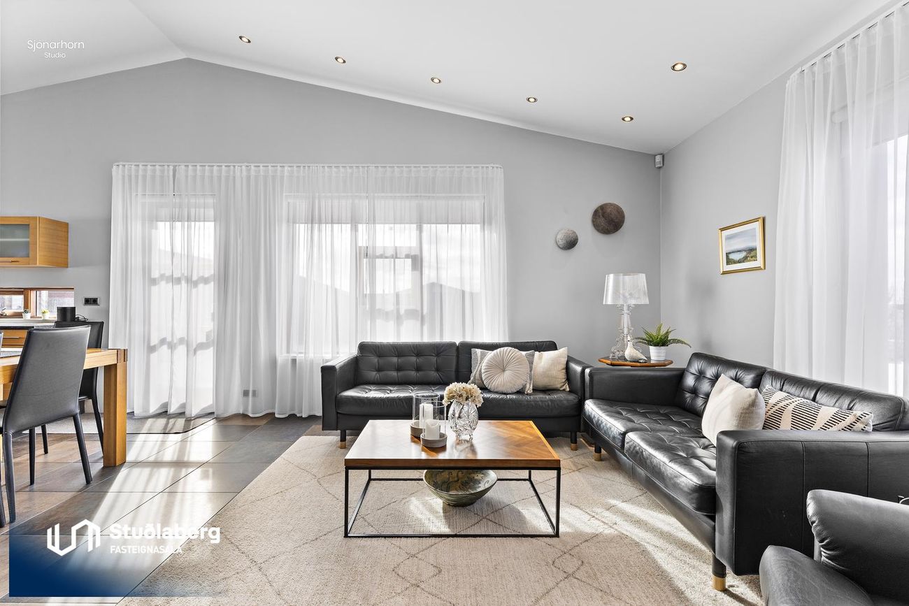 borðstofa eru í opnu rými með stórum og björtum gluggum, samtengt eldhúsi og alrými. Flísar eru á gólfum.
