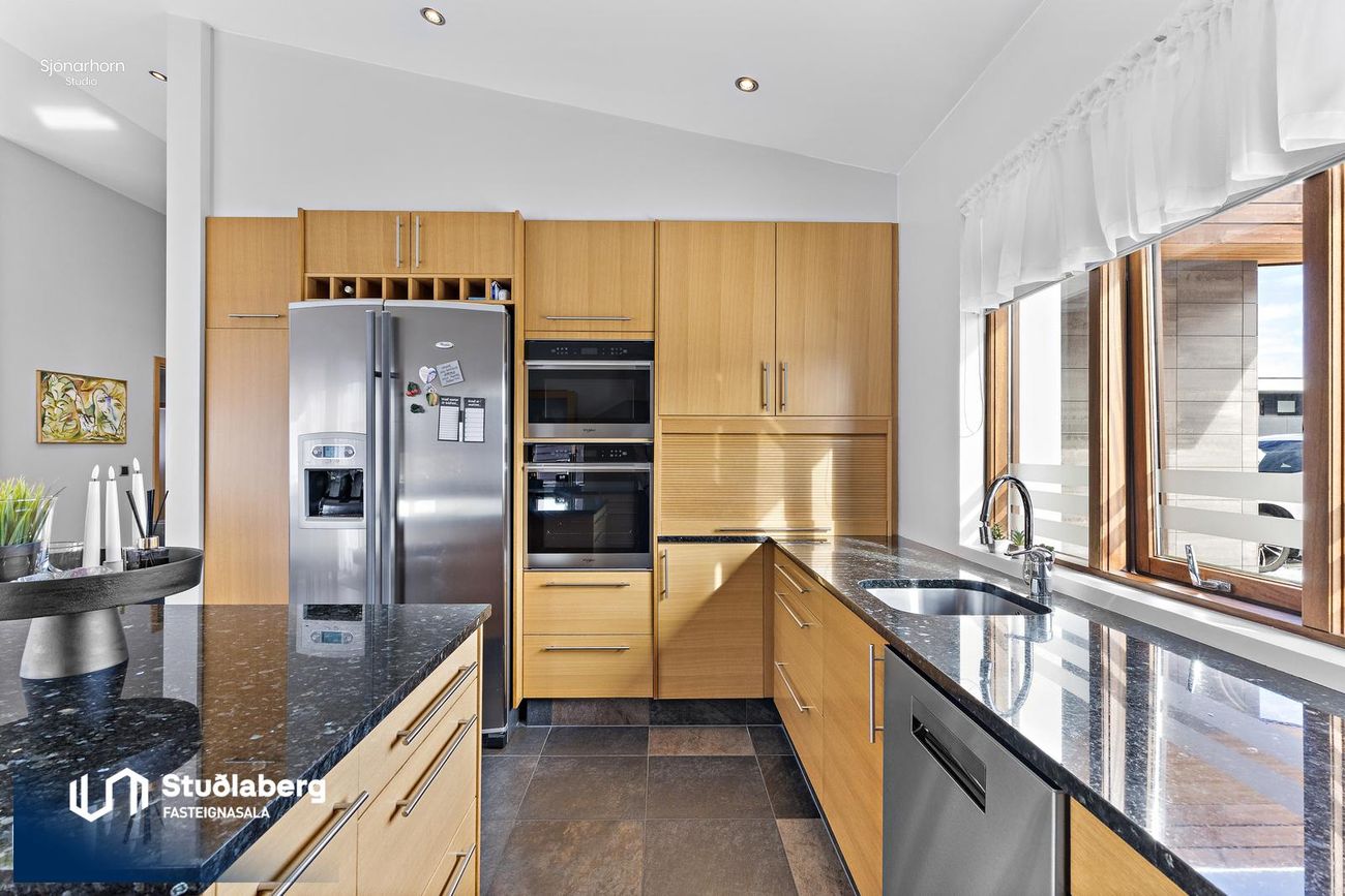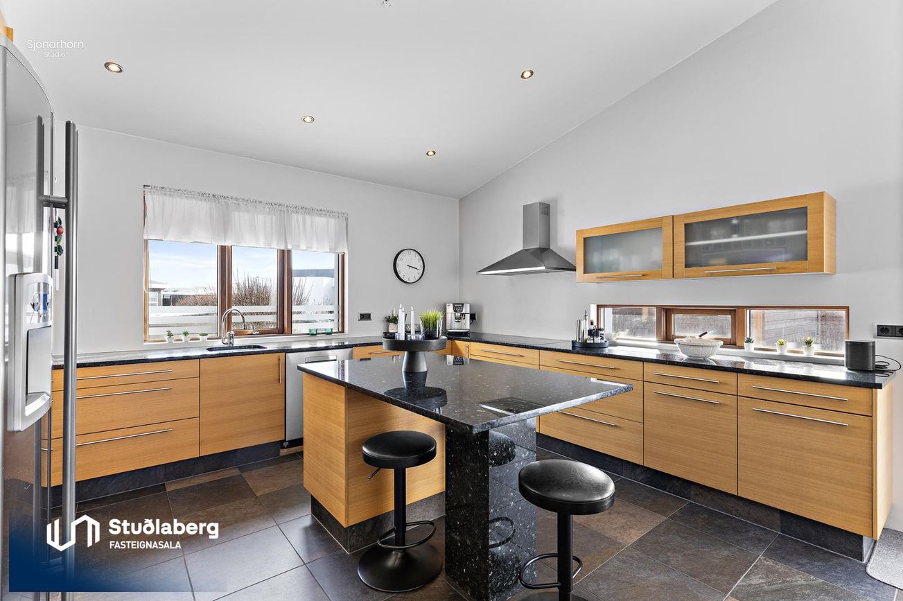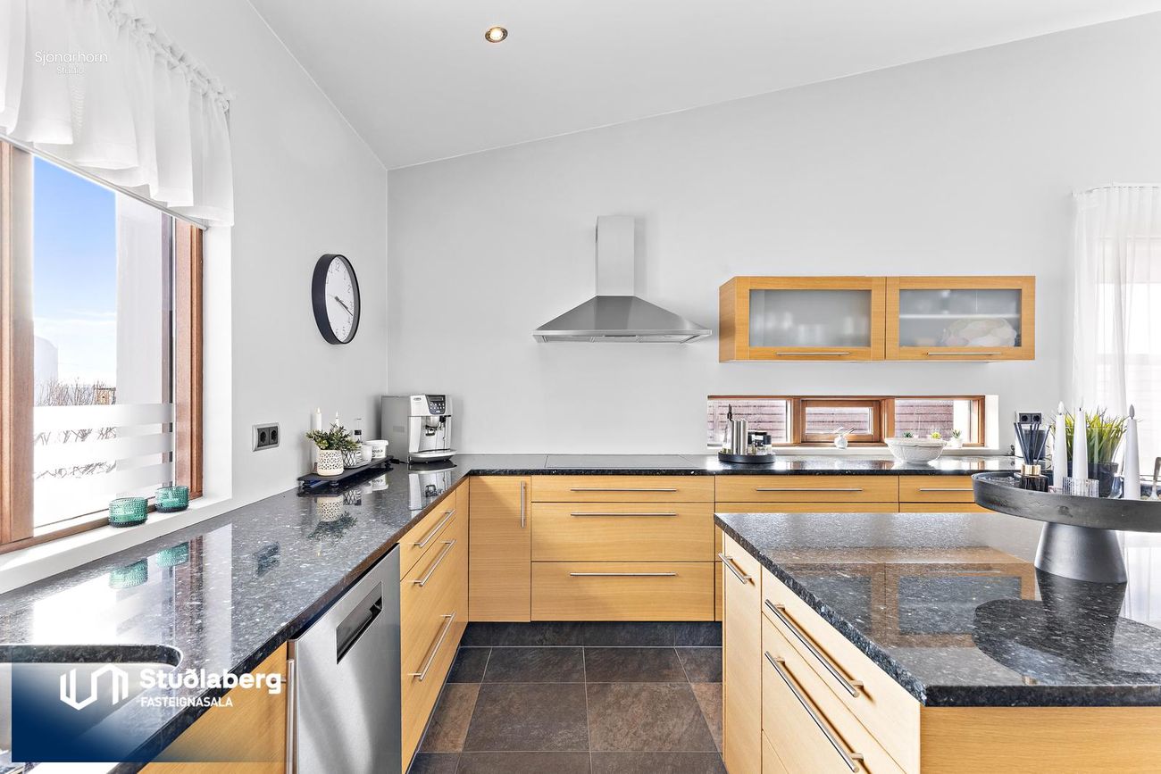 Eldhús er flísalagt og með sérsmíðaðri eikar innréttingu, borðplata úr steini. Eyja er í eldhúsi ásamt tækjum og gott skápapláss.
