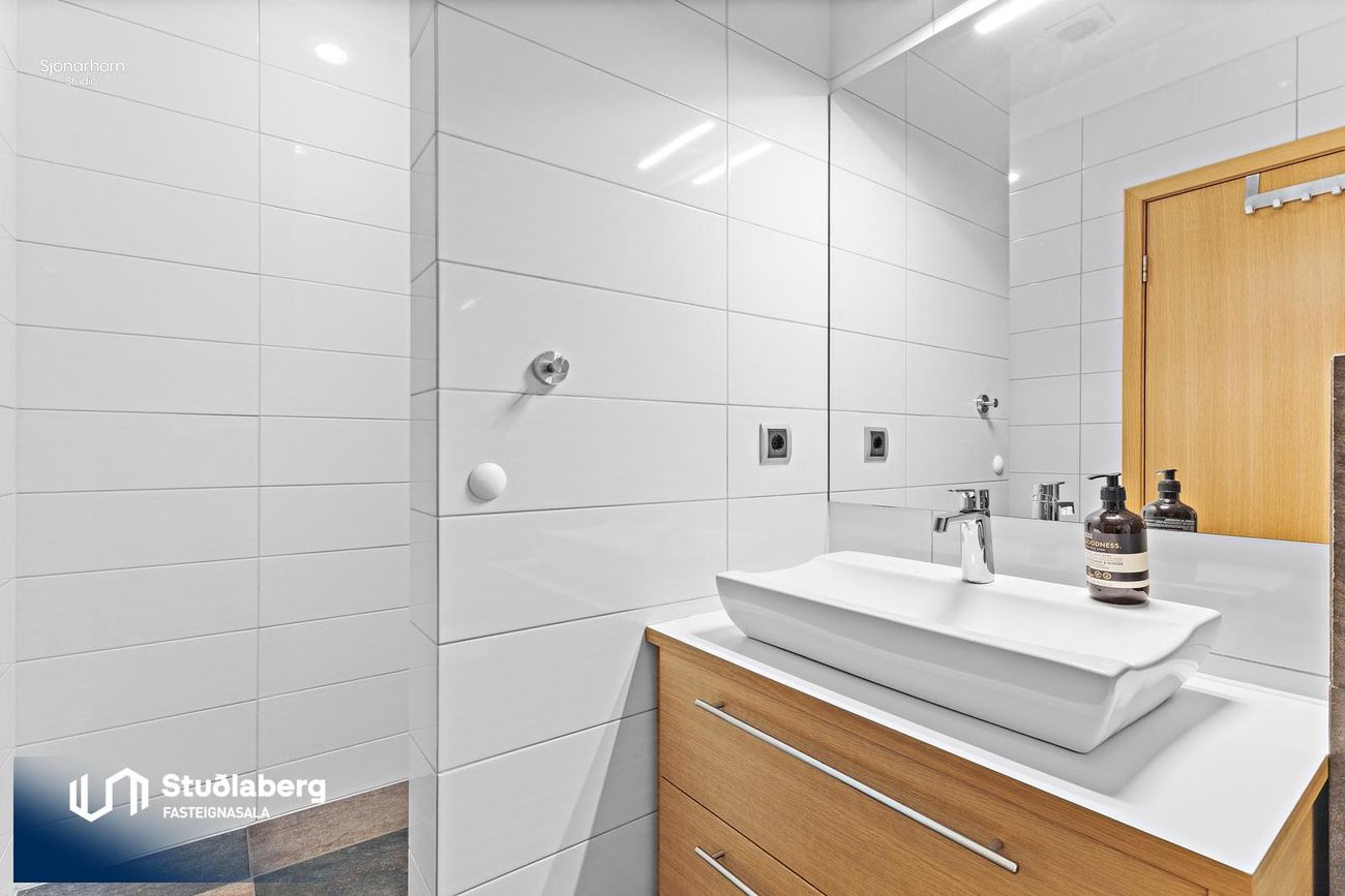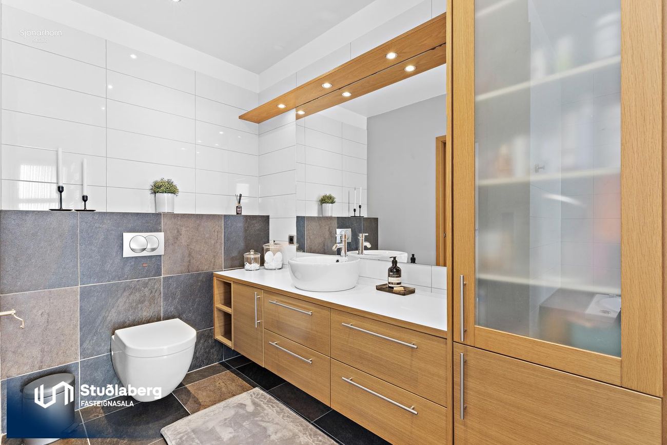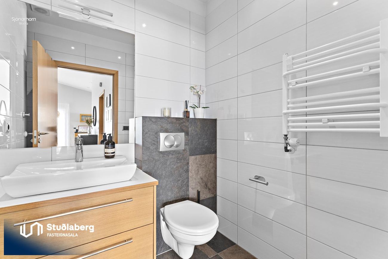 Gestabaðherbergi. Gengið er inn í baðherbergi frá alrými. Flísalagt í hólf og gólf. Sturta, upphengt salerni, eikar innrétting ásamt Handklæðaofn.