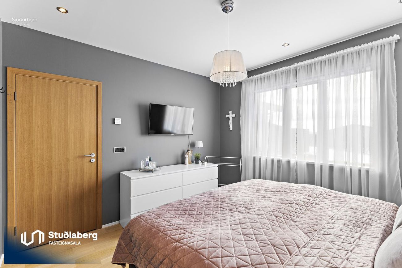 Sjónvarpshol er rúmgott og tengir við svefnherbergisgang, eikar parket á gólfi. Rennihurð er á milli sjónvarpshols og alrýmis.