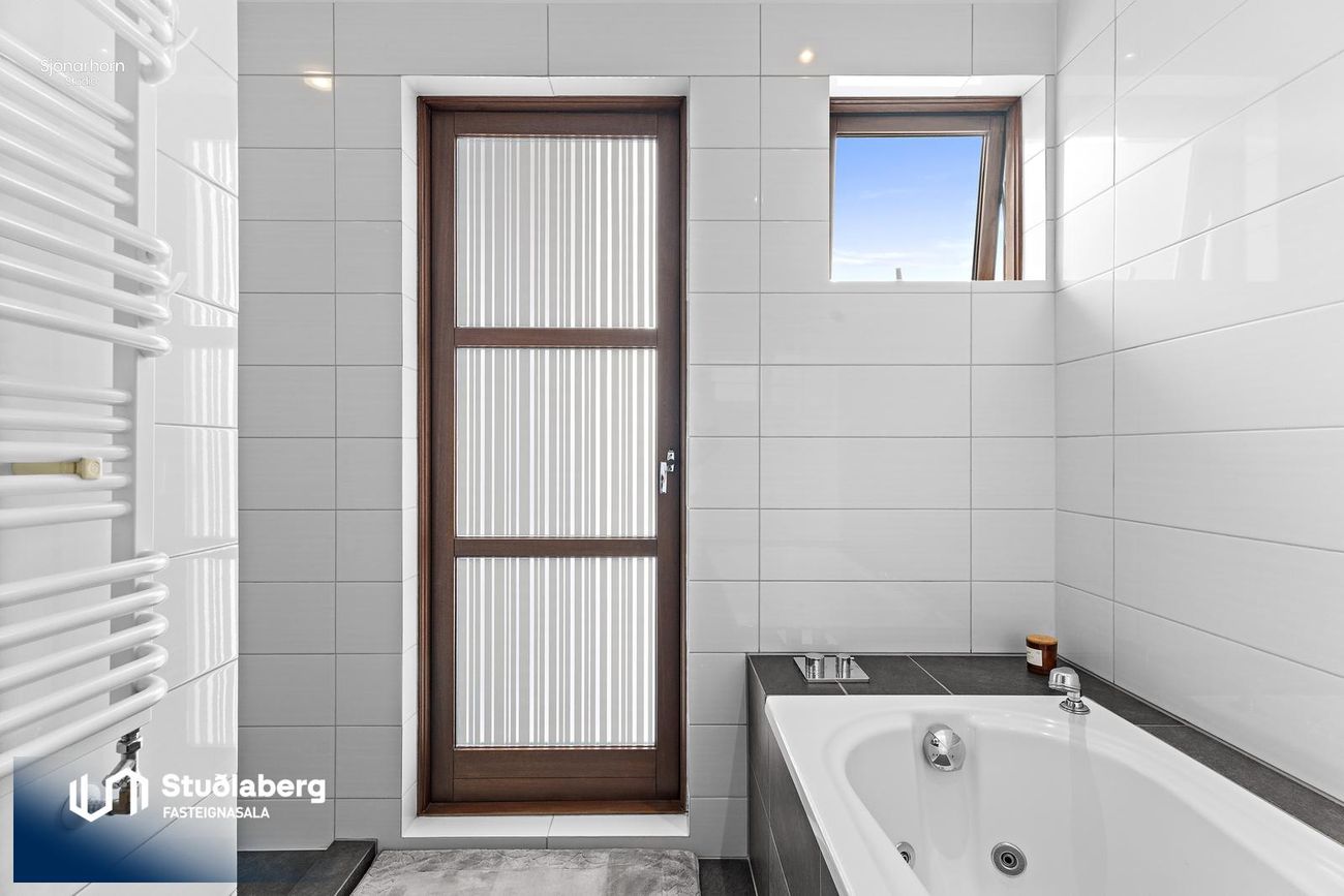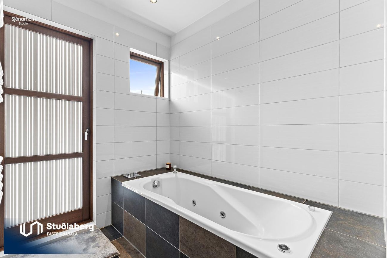 Baðherbergi er flísalagt í hólf og gólf. Baðkar, upphengt salerni, sturta. Eikar innrétting. Handklæðaofn. Útgengt er á lóð frá baðherbergi.