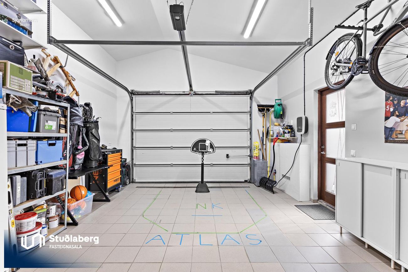 Bílskúr er stór og rúmgóður með flísum á gólfi, innaf af bílskúr er rými sem í dag er nýtt sem vinnuherbergi, þar er salernisaðstaða. Hurð út á lóð. Rými sem bíður uppá ýmsa möguleika.