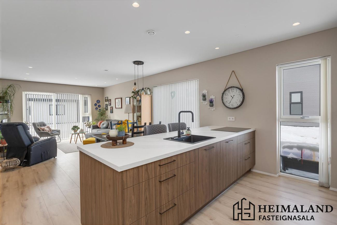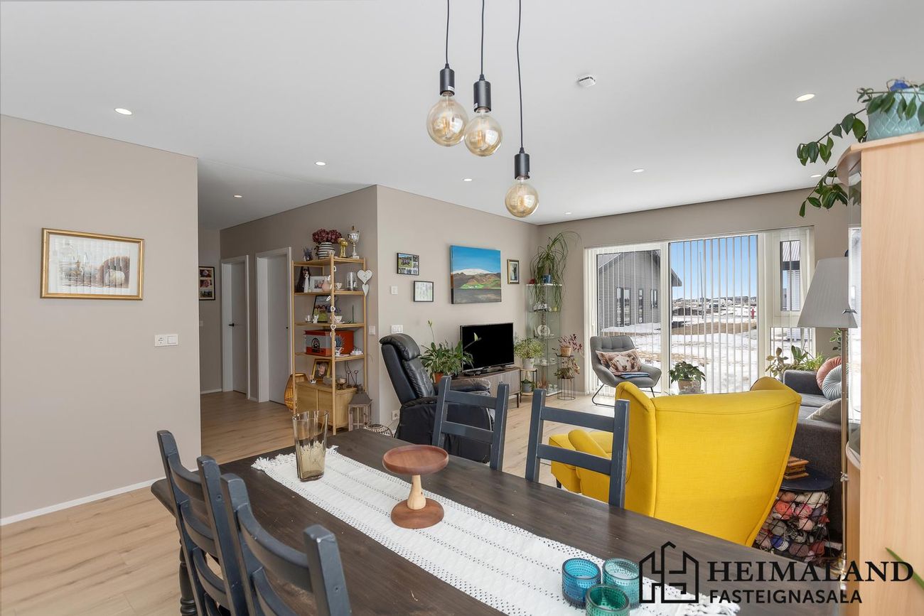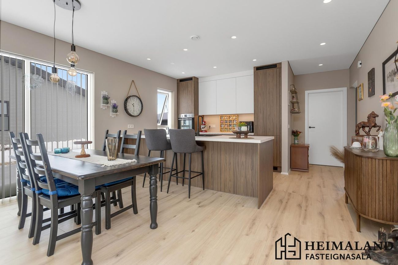 Alrými samanstendur af eldhúsi, borðstofu og stofu. Eldhús er með rúmgóðri innrétting frá Voke-3 með innbyggðum ísskáp og uppþvottavél. Harðparket er á gólfum.
