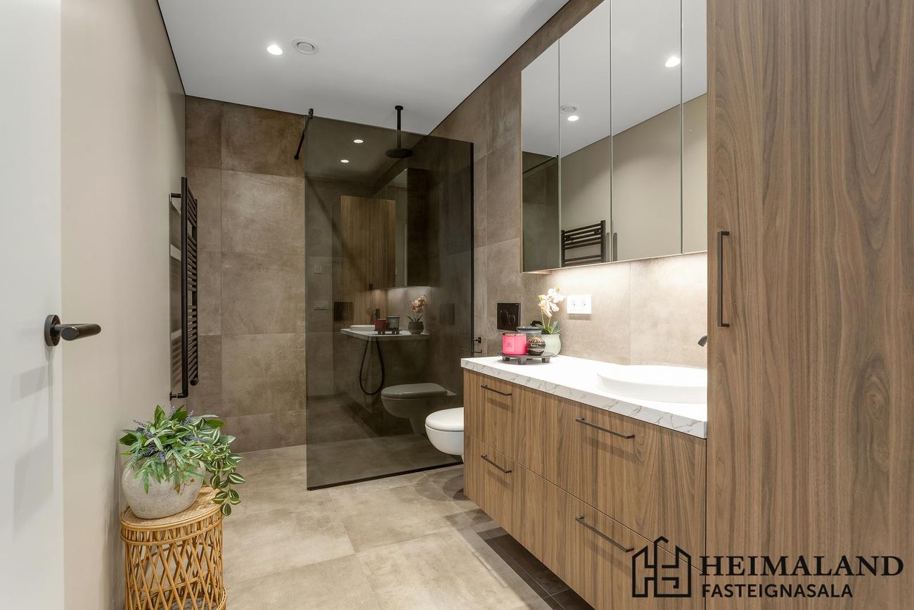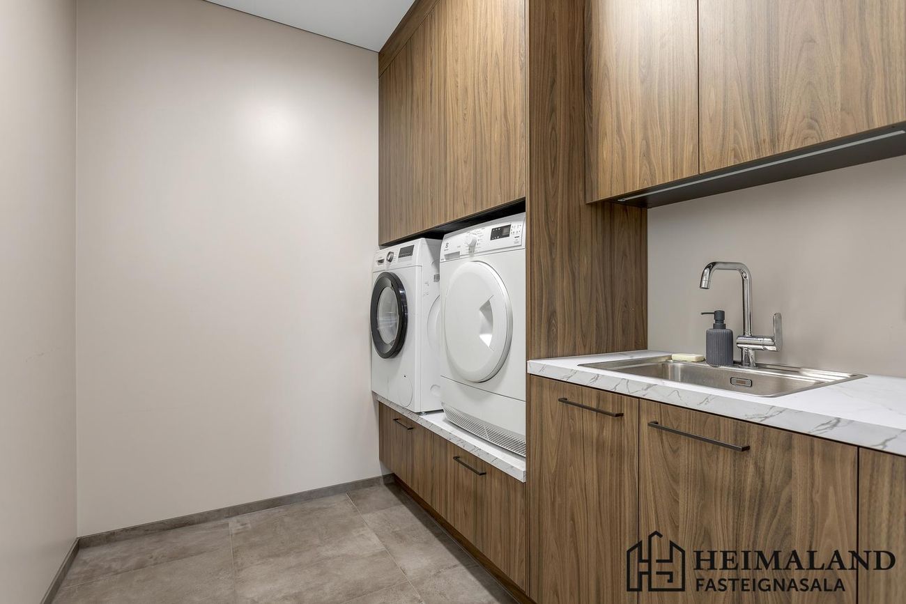 Þvottahús er flísalagt með rúmgóðri innréttingu þar sem gert er ráð fyrir þvottavél og þurrkara í vinnuhæð.