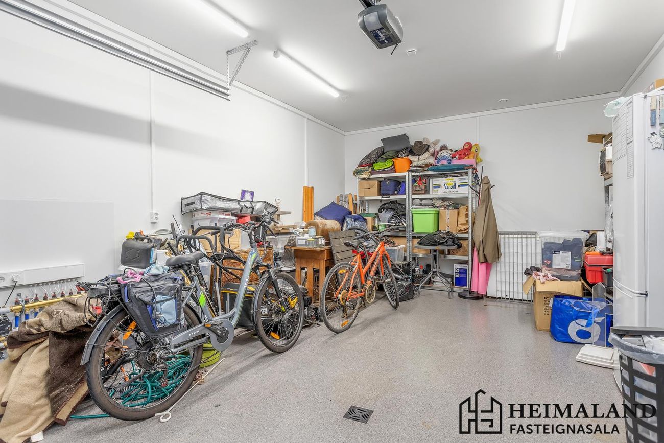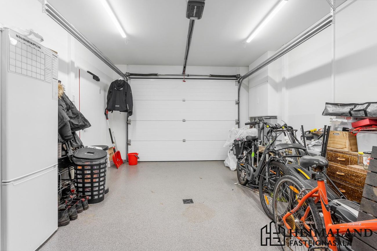 Bílskúrinn er snyrtilega frágenginn með epoxy á gólfum.