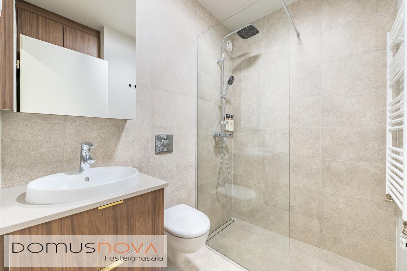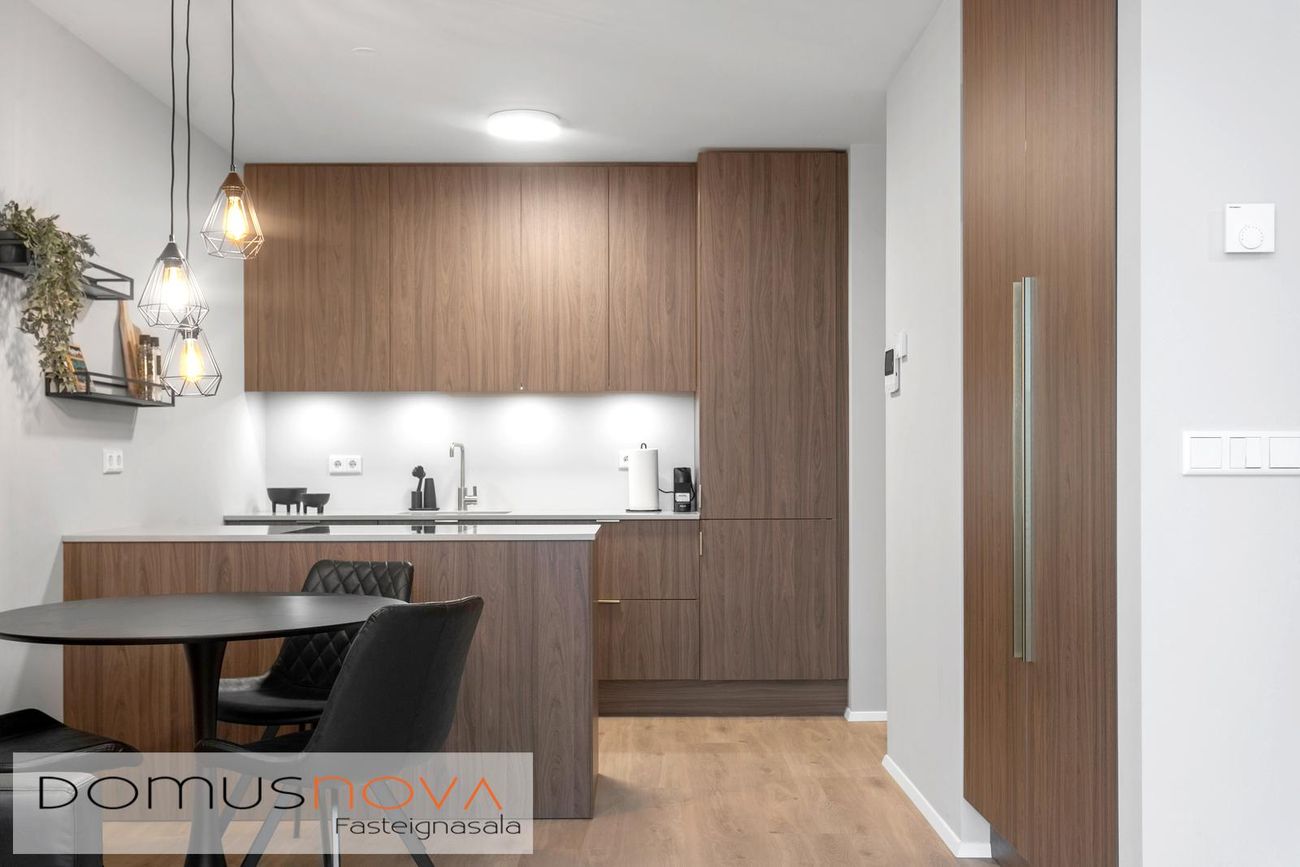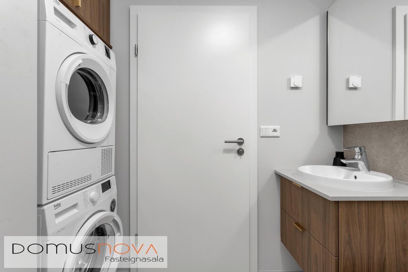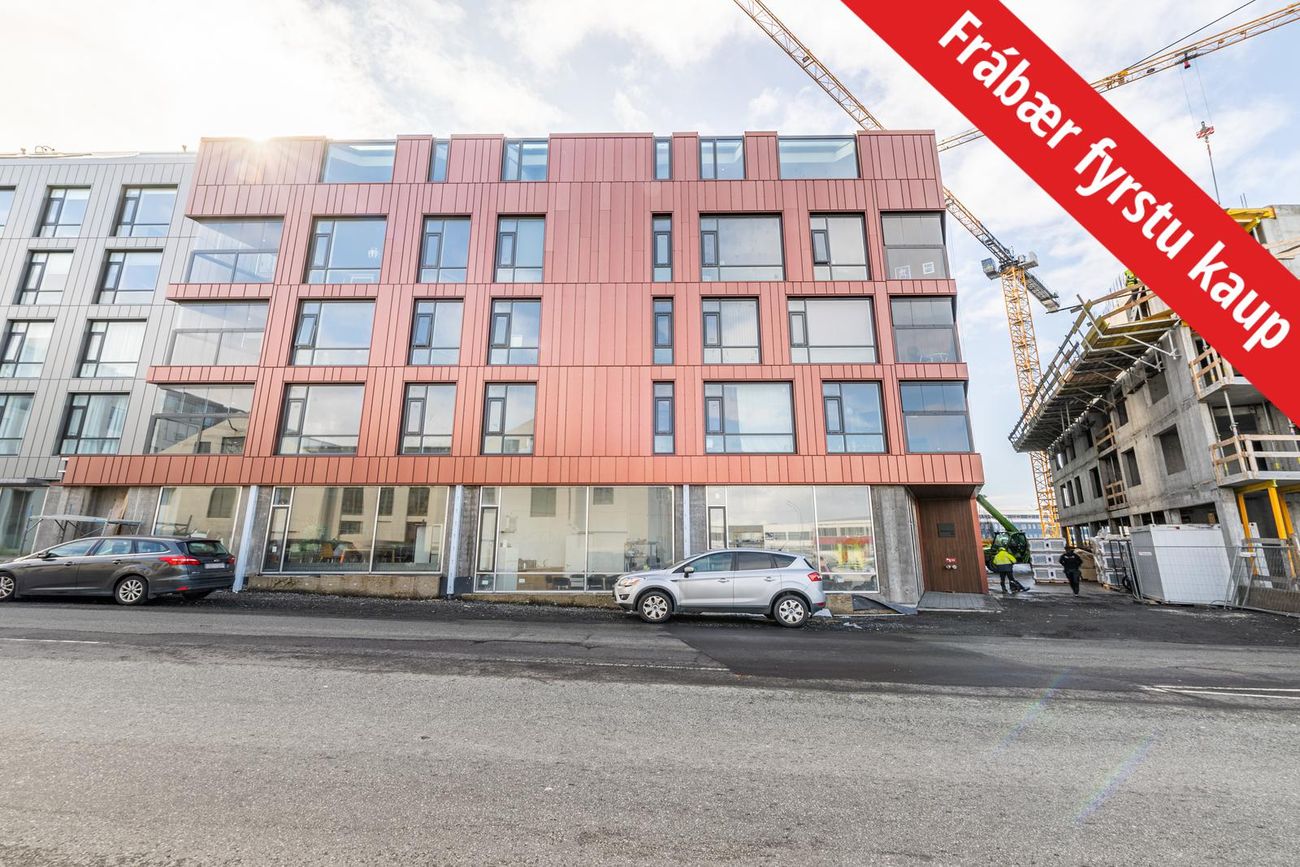 Innréttingar og gólfefni: Innréttingar og skápar eru íslensk smíði frá AXIS og borðplata í eldhúsi er ljós Quartz-steinn frá Granítsmiðjunni. Eldhústæki eru vönduð. Innbyggður ísskápur með frysti. Spanhelluborð og bakaraofn. Gólfhitakerfi með Danfoss stýribúnaði.