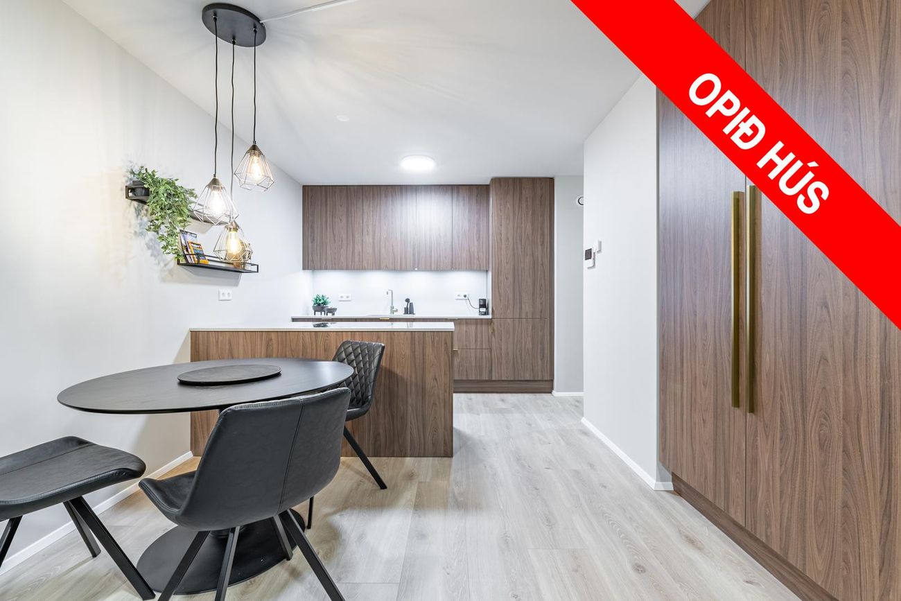 Eldhús - Er opið inn i stofu með snyrtilegri, dökkri viðarinnréttingu með efri og neðri skápum, innbyggður ísskápur og uppþvottavél sem fylgja eigninni, eyja með span helluborði og bakaraofni, steinplötur á borðum.
