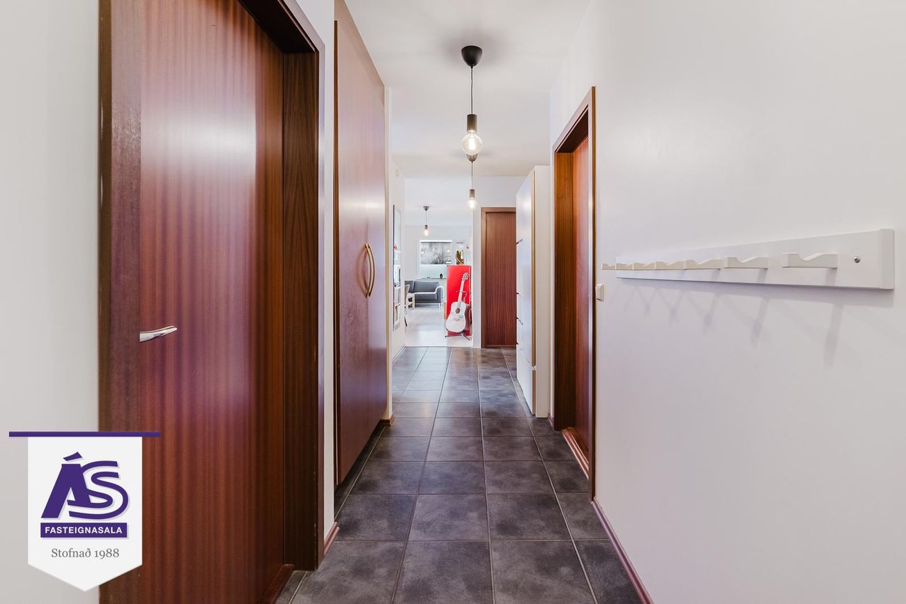 Flísaleg gólf í forstofu og þvottahúsi, parket í svefnherbergjum og geymslu, dökk viðarinnrétting í eldhúsi
