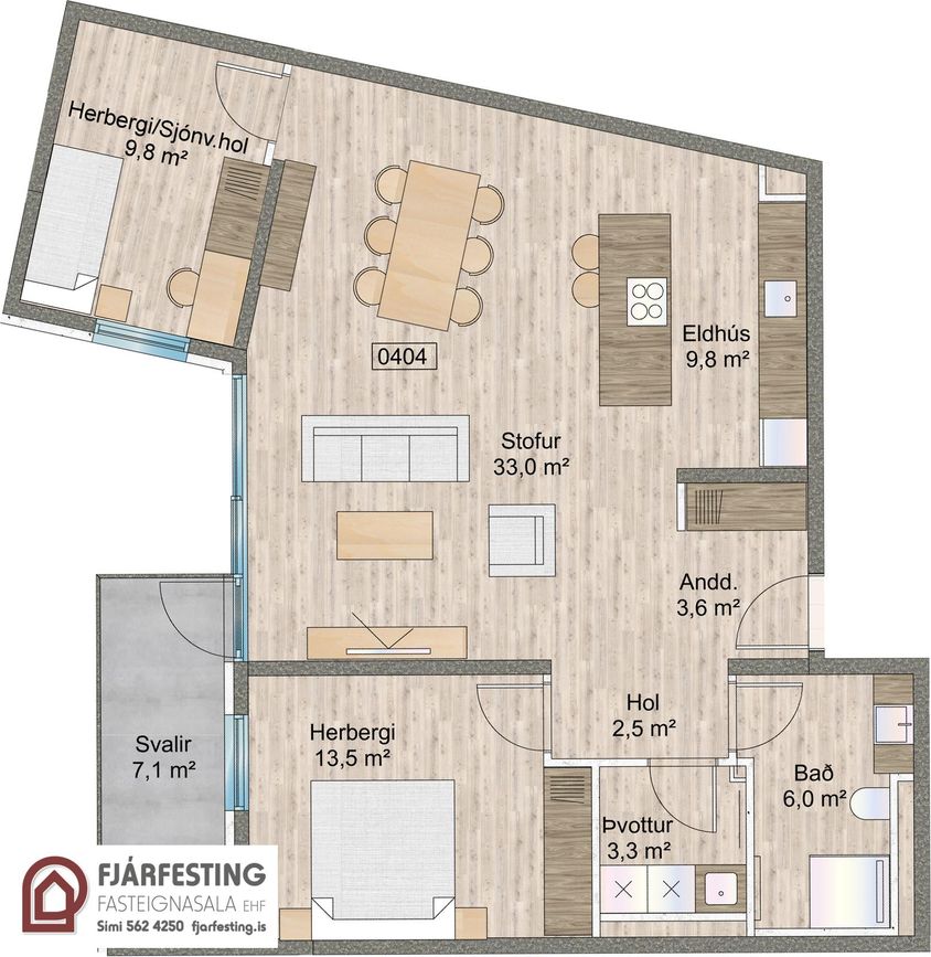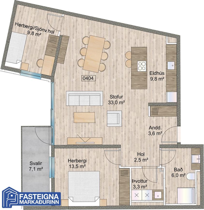 Eignin skiptist í forstofu, hol, hjónaherbergi með fataskápum, barnaherbergi með fataskápum, baðherbergi, þvottaherbergi, eldhús með eyju, stofu og borðstofu.