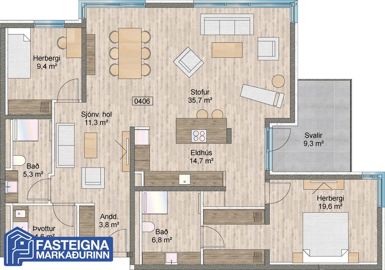 Íbúðin er á 4. hæð með góðri lofthæð. Hún skiptist í forstofu, hol, hjónaherbergi með fataherbergi og sérbaðherbergi, barnaherbergi, eldhús með eyju og rúmgóða stofu og borðstofu. Úrvalsefni og vönduð hönnun.